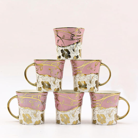 Premium Ceramic Pink Gold Line Flowers Tea Cup Set of 6, 180 ML, Femora