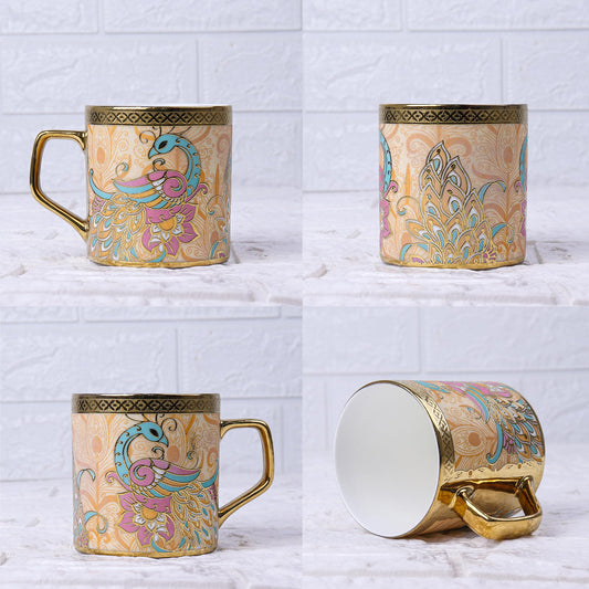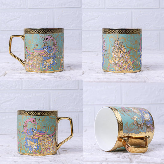 Premium Ceramic Peacock Heaven Gold Tea Cup Set of 6, 160 ML, Femora