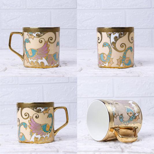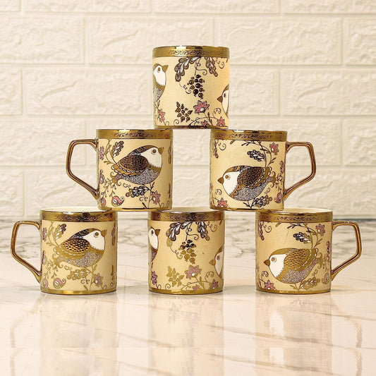 Premium Ceramic Dancing Peahens Gold Coffee & Tea Cup Set of 6, 160 ML, Femora