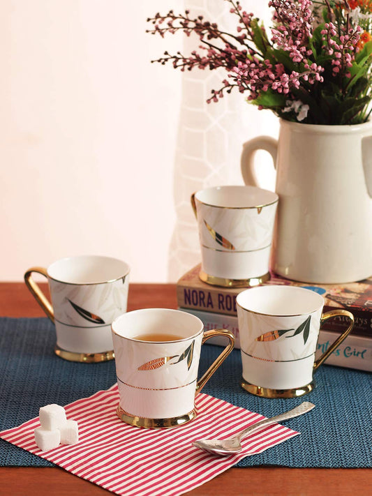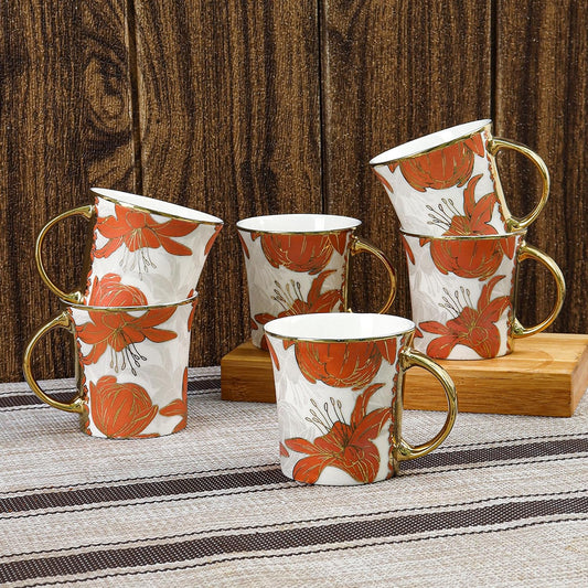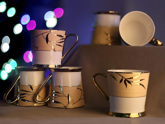 Premium Ceramic Gold Floral Buds Leaves Coffee & Tea Cup Set of 6, 160 ML, Femora