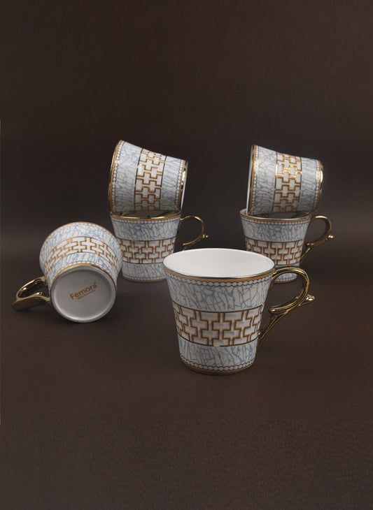 Premium Ceramic Blue Craze Pattern on Golden Tea Cup Set of 6, 160 ML, Femora