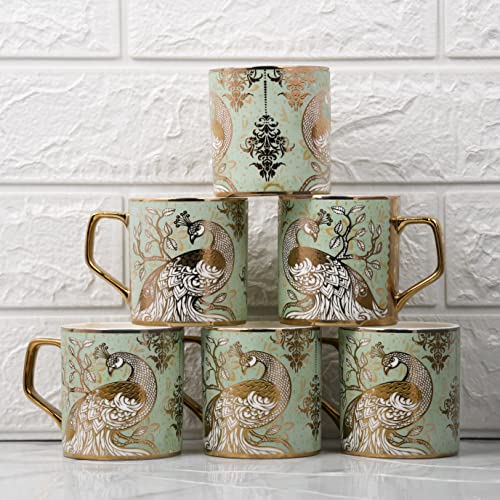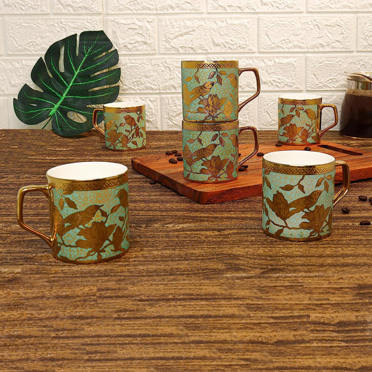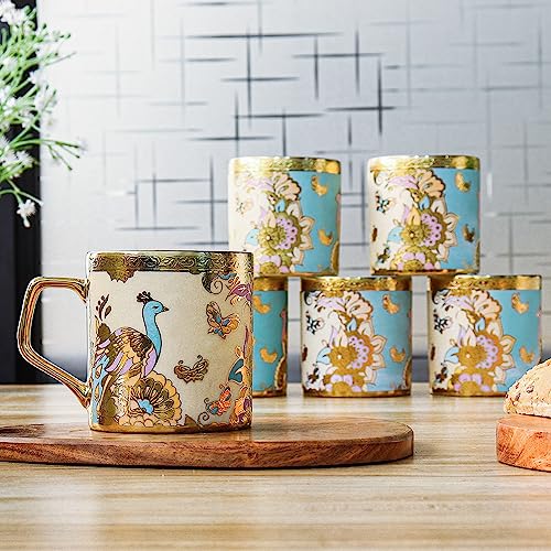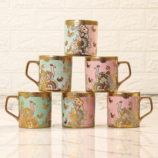 Premium Ceramic Peacock Motif with Leaves Pattern Coffee & Tea Cup Set of 6, 180 ML, Femora