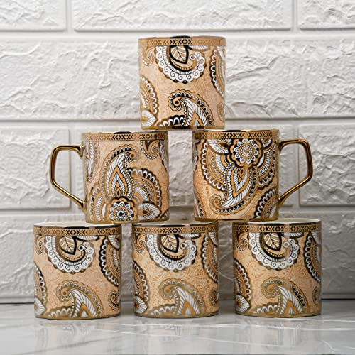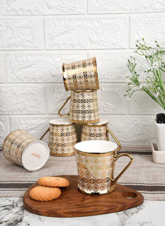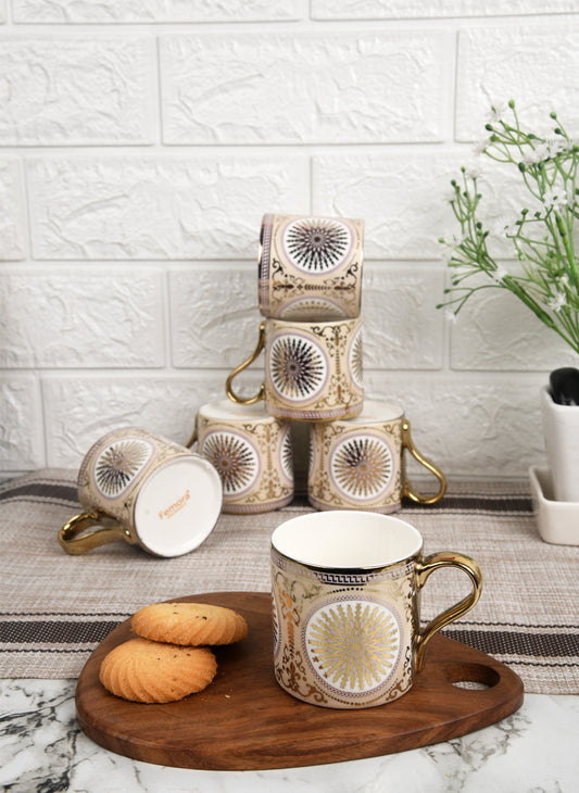 Premium Ceramic Mandala Pattern With Golden Handle Coffee & Tea Cup Set of 6, 180 ML, Femora