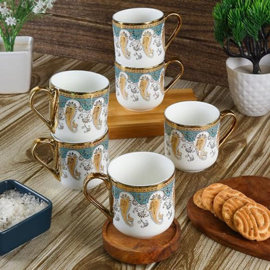 Premium Ceramic Golden Royal Mehendi Print blue Coffee & Tea Cup Set of 6, 180 ML, Femora