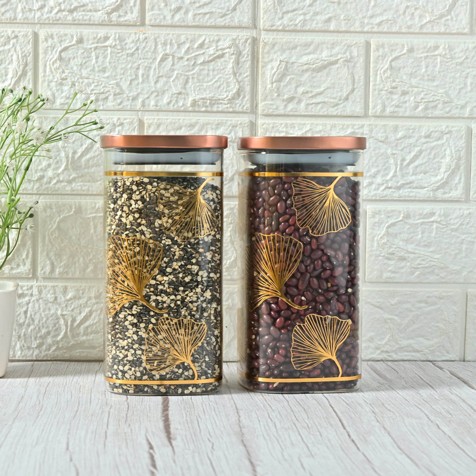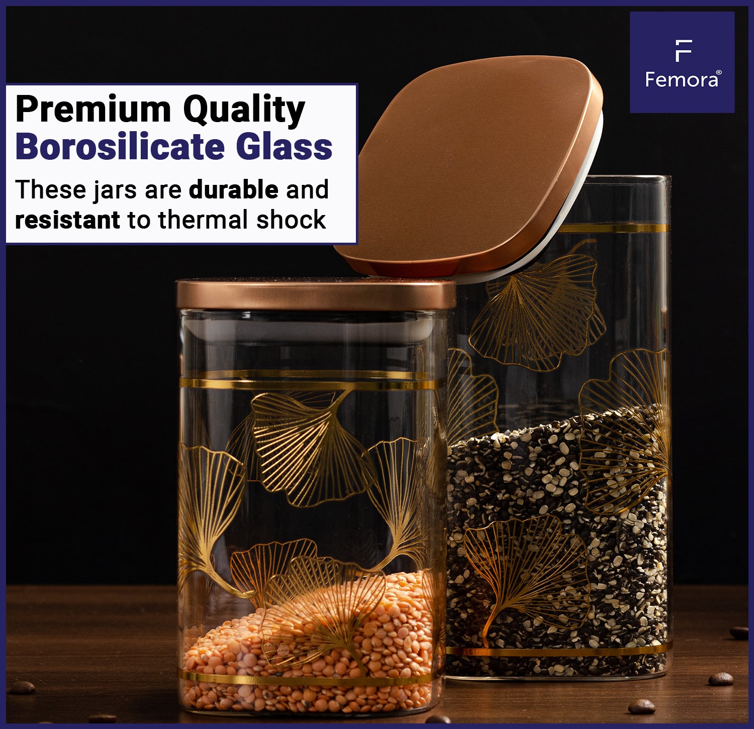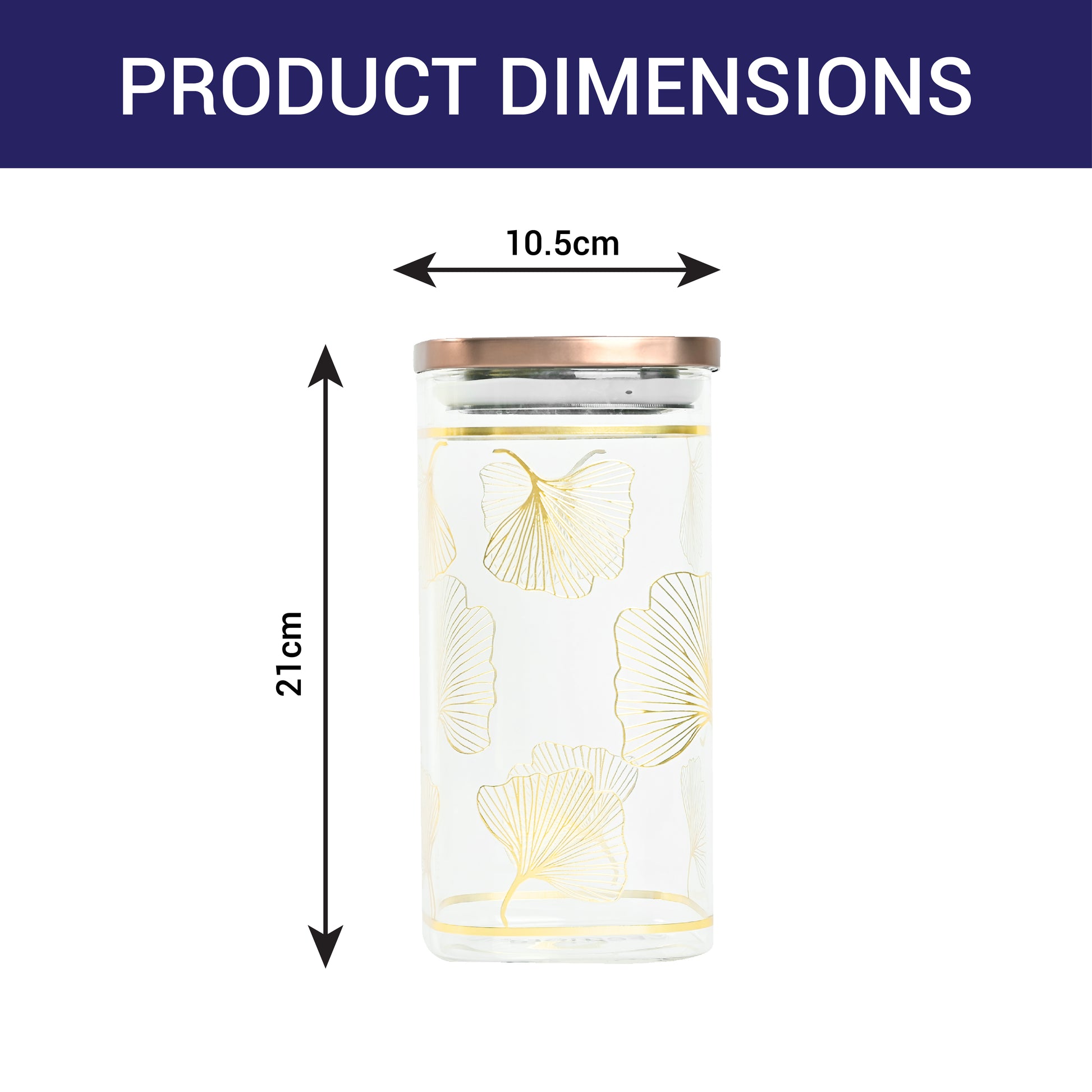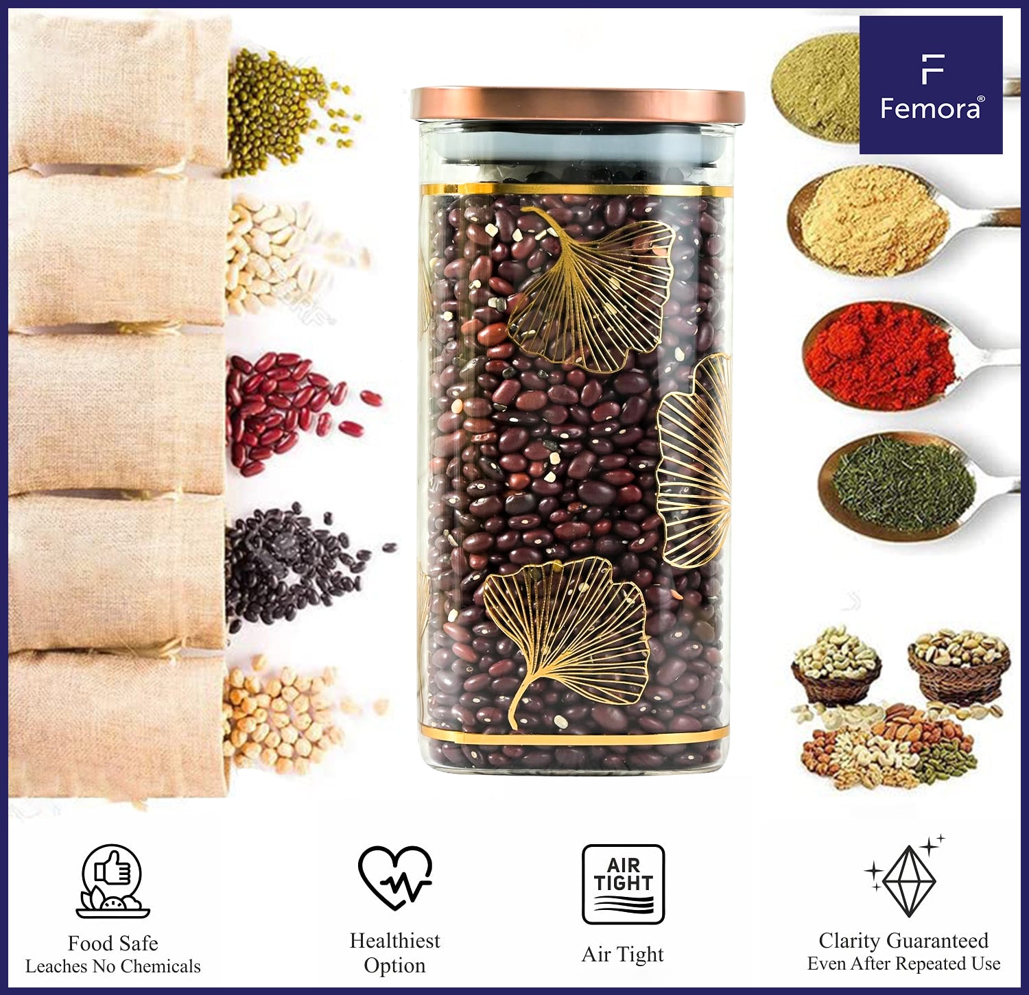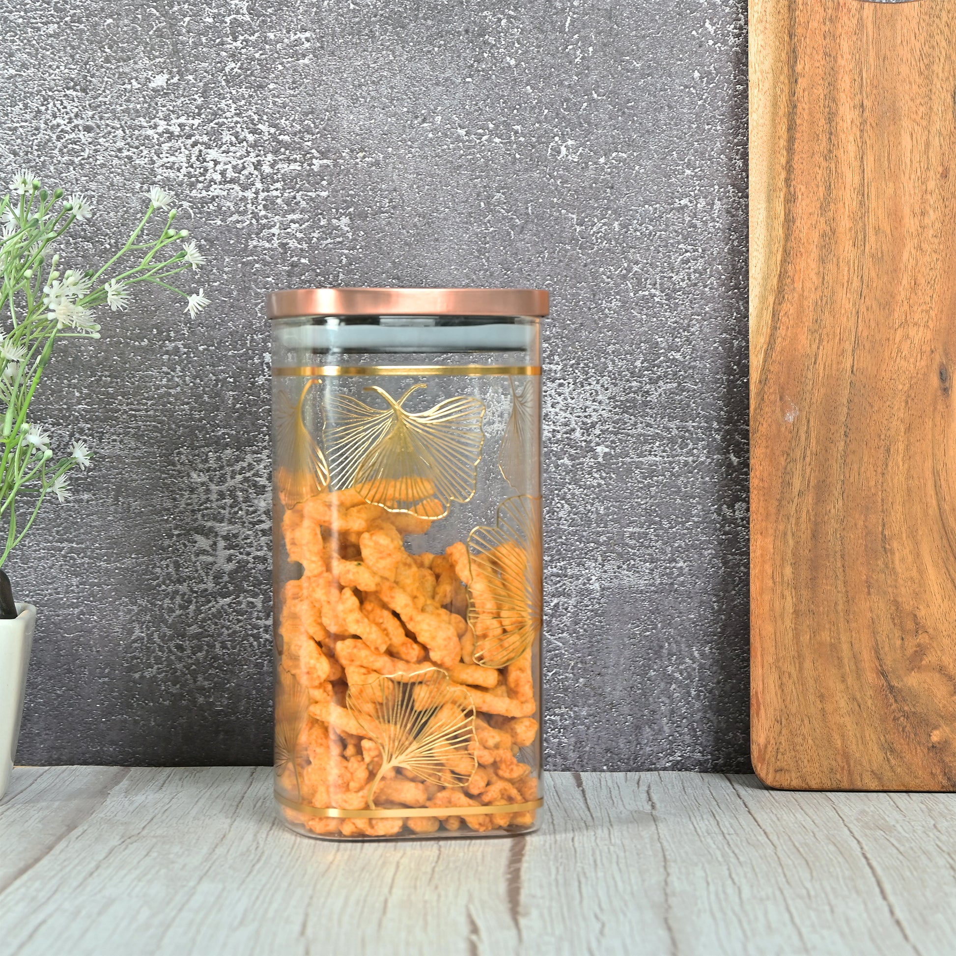 Borosilicate Glass Square Gold Print Kitchen Storage Jar, Airtight Steel Lid, Femora