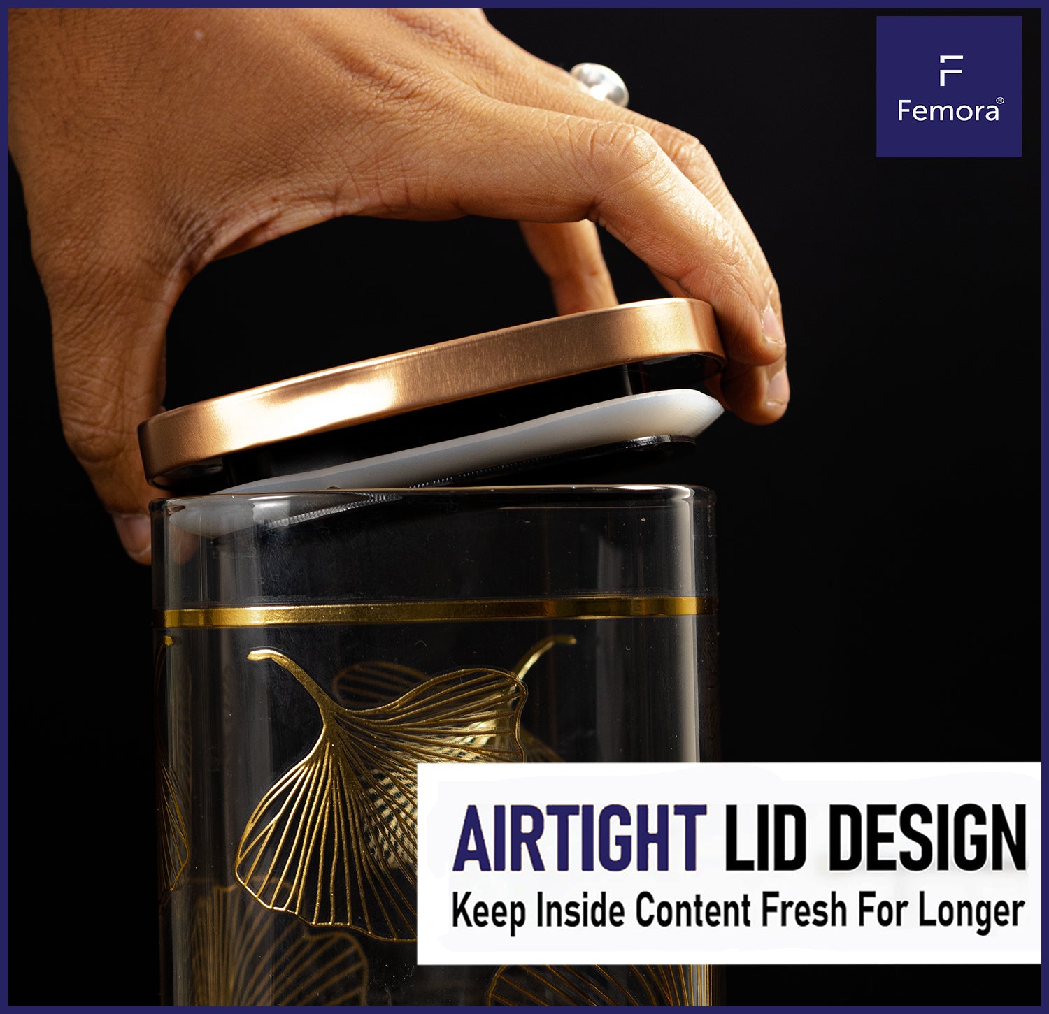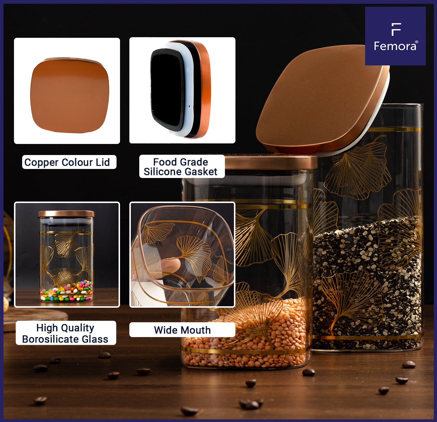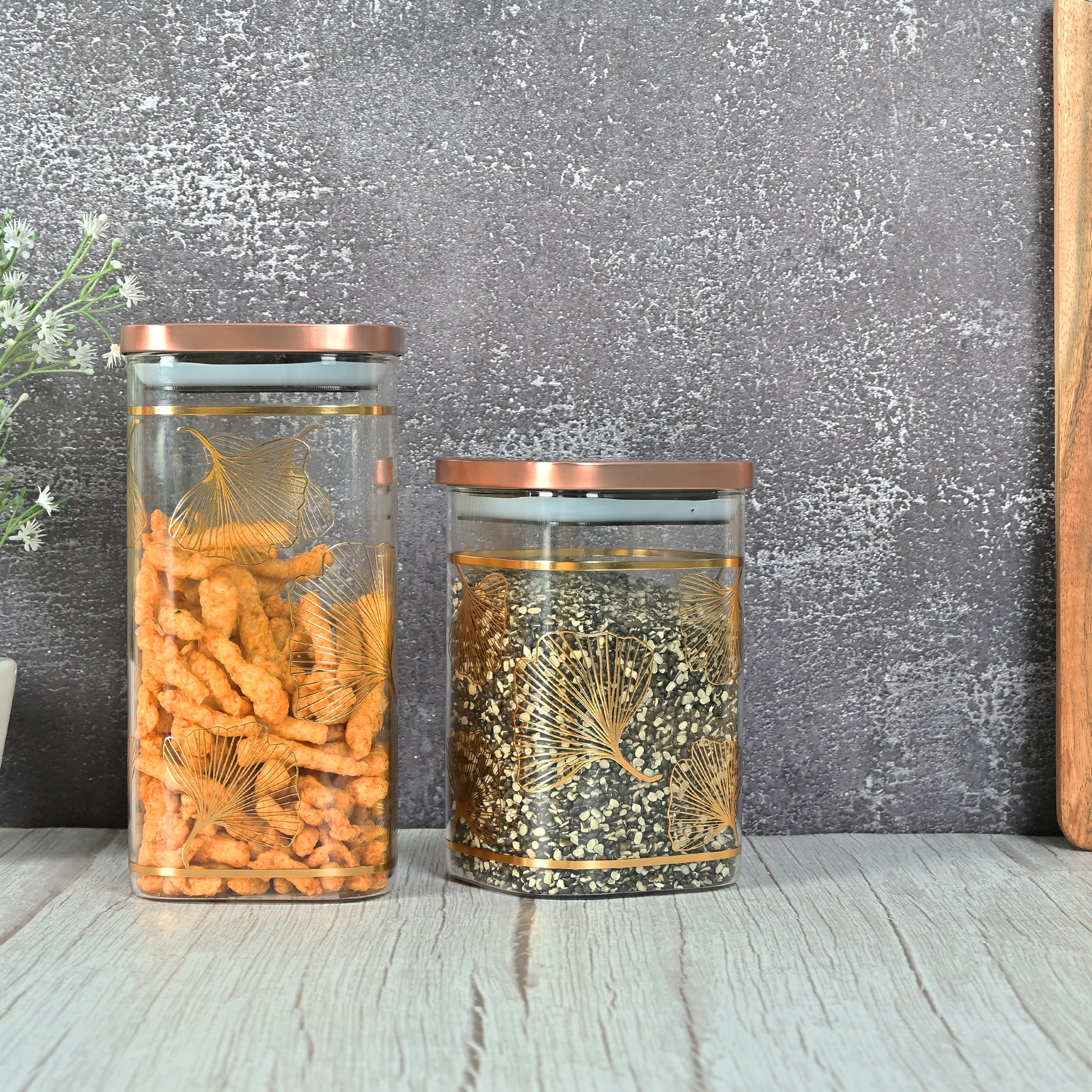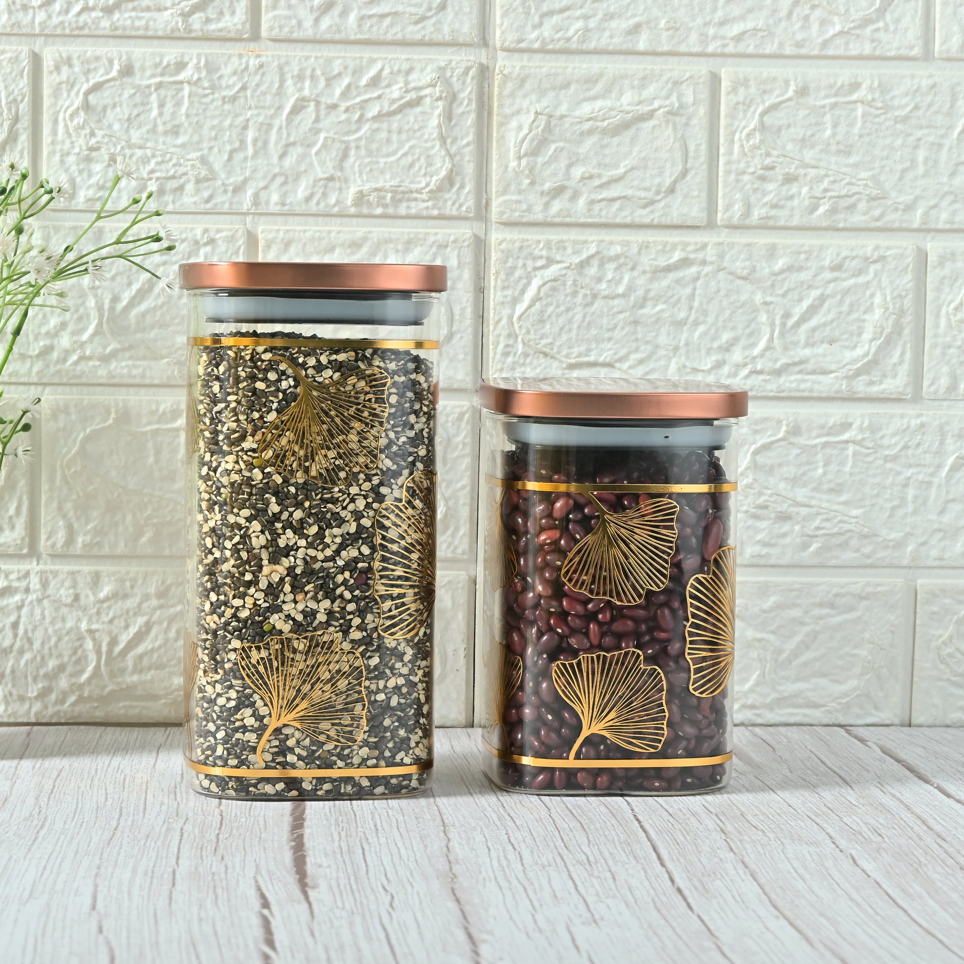 Borosilicate Glass Square Gold Print Kitchen Storage Jar, Airtight Steel Lid, Femora