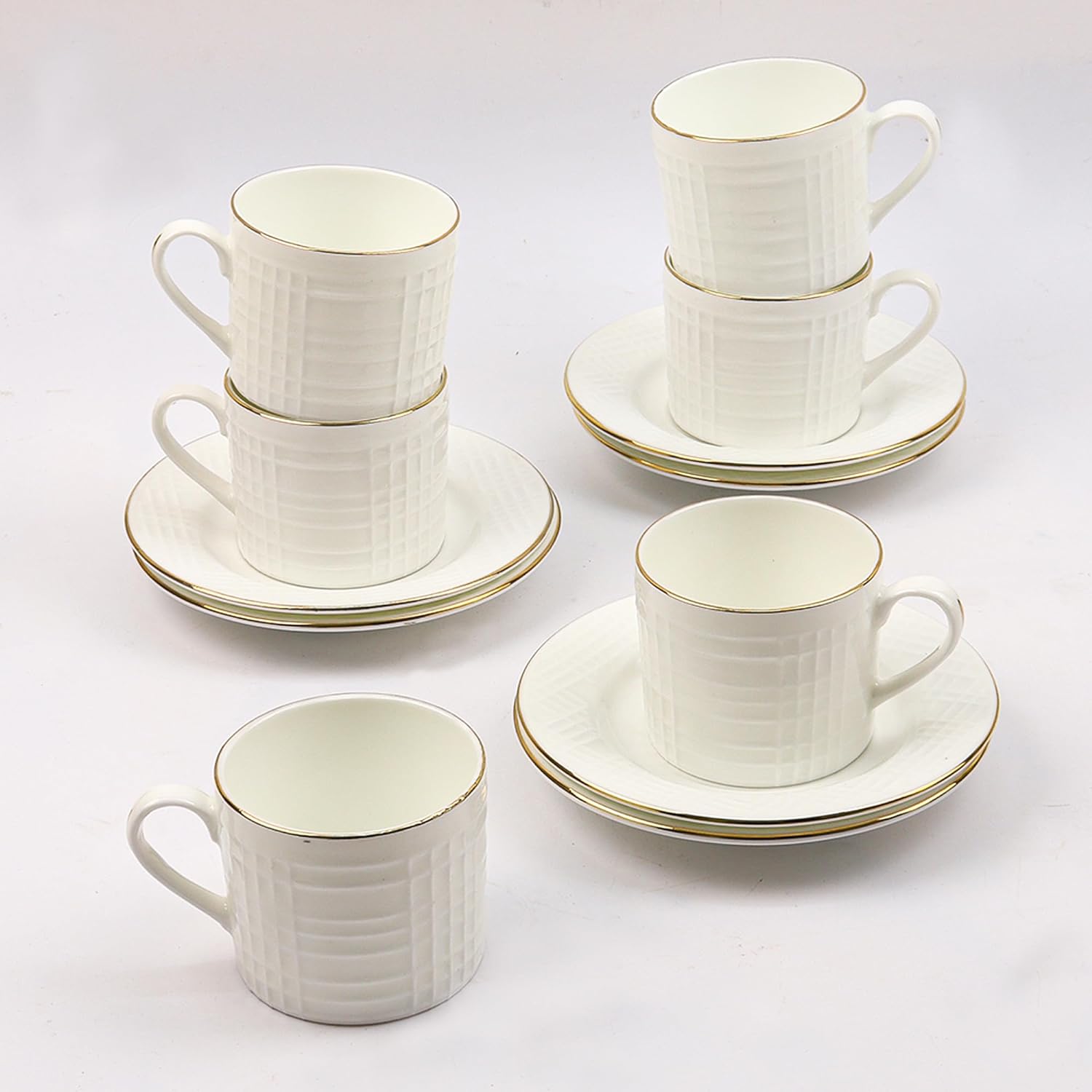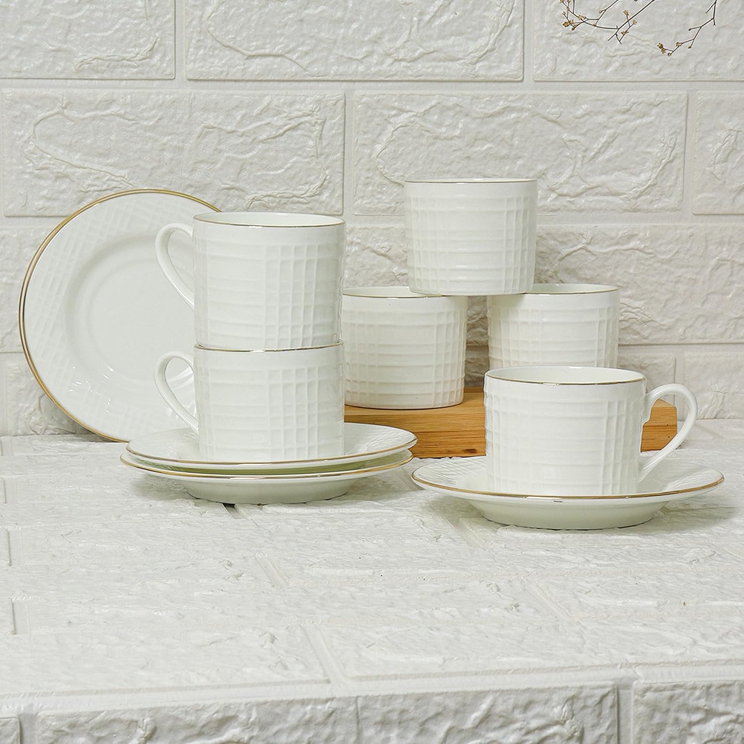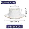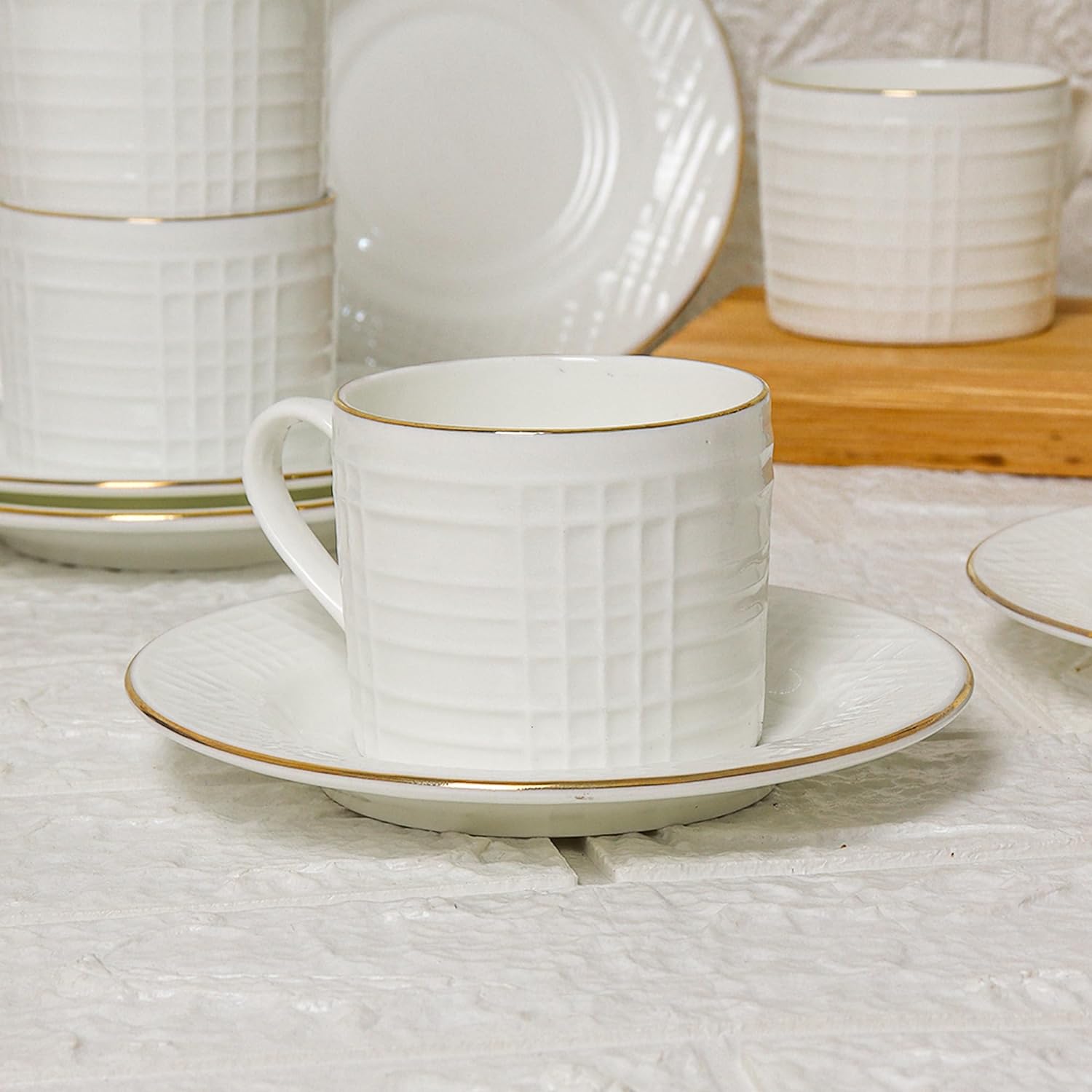 Ceramic Gold Line Square Cut White Tea Cup Set with Saucer, 200 ML, 6 Cups, 6 Saucers, Femora