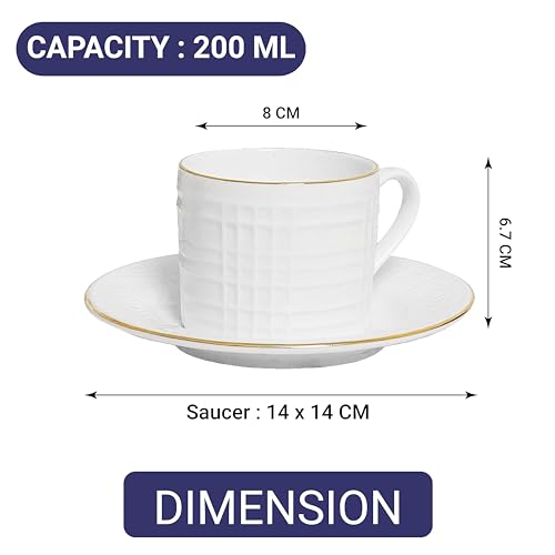 Capacity: 200 ML. Package Content: 6 Cups + 6 Saucers