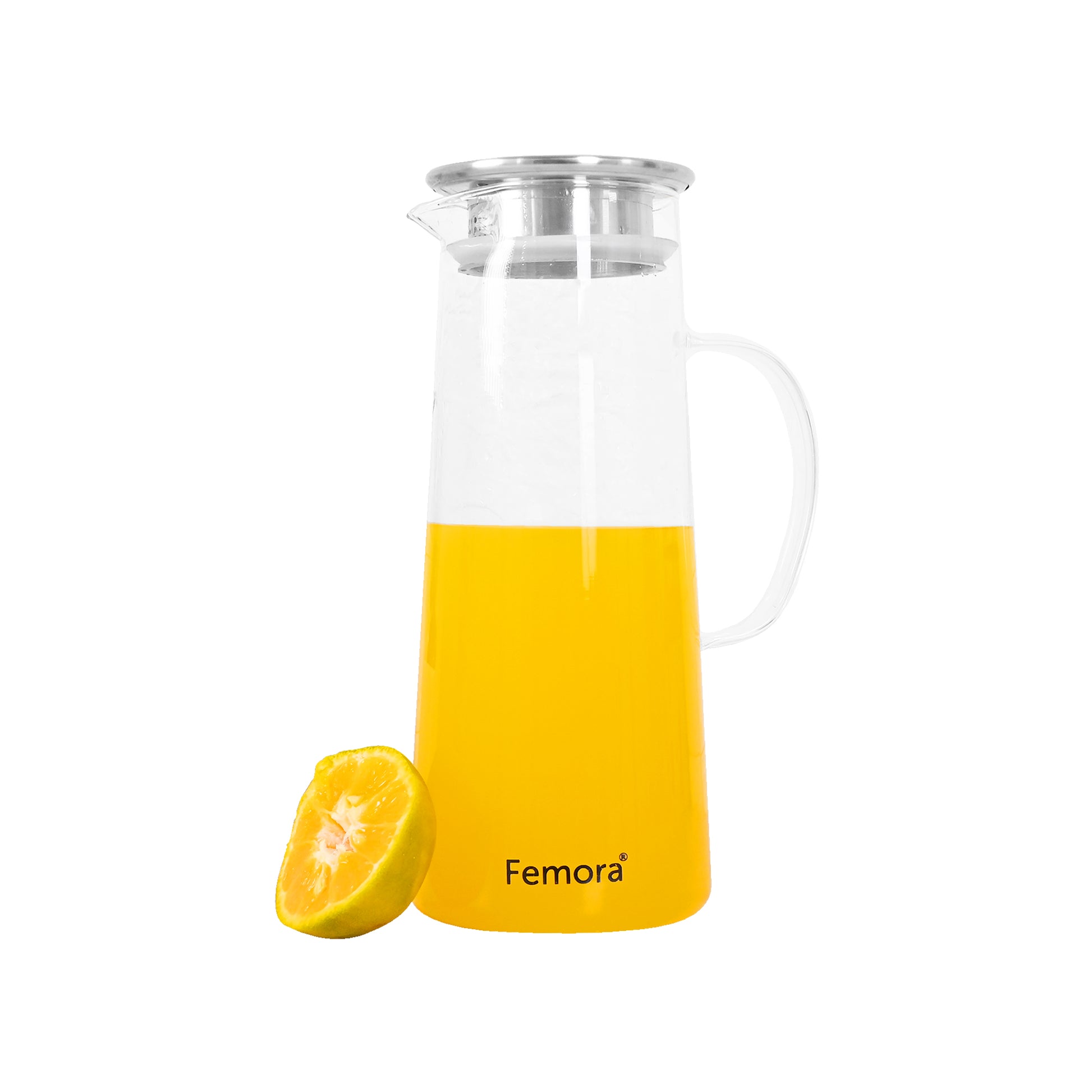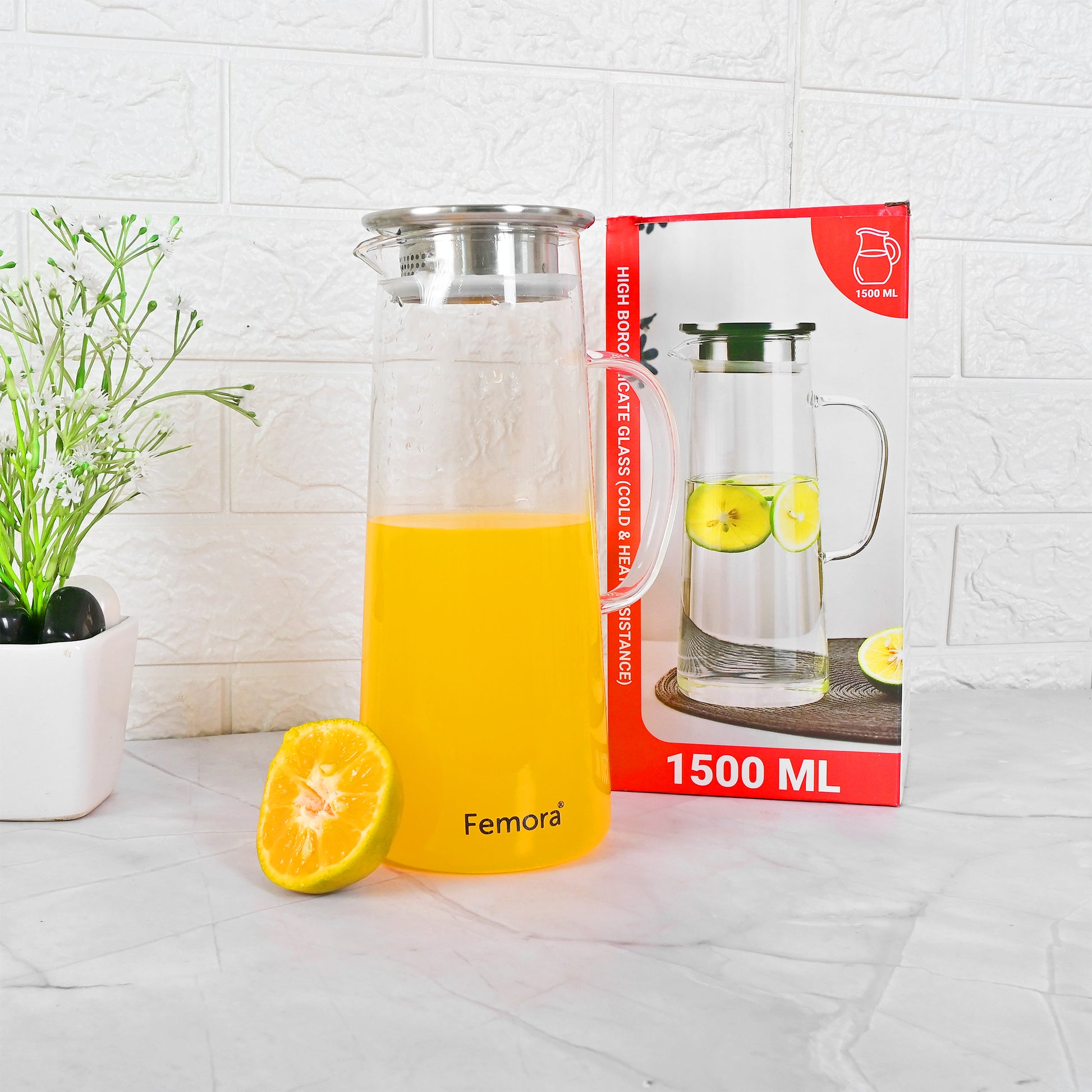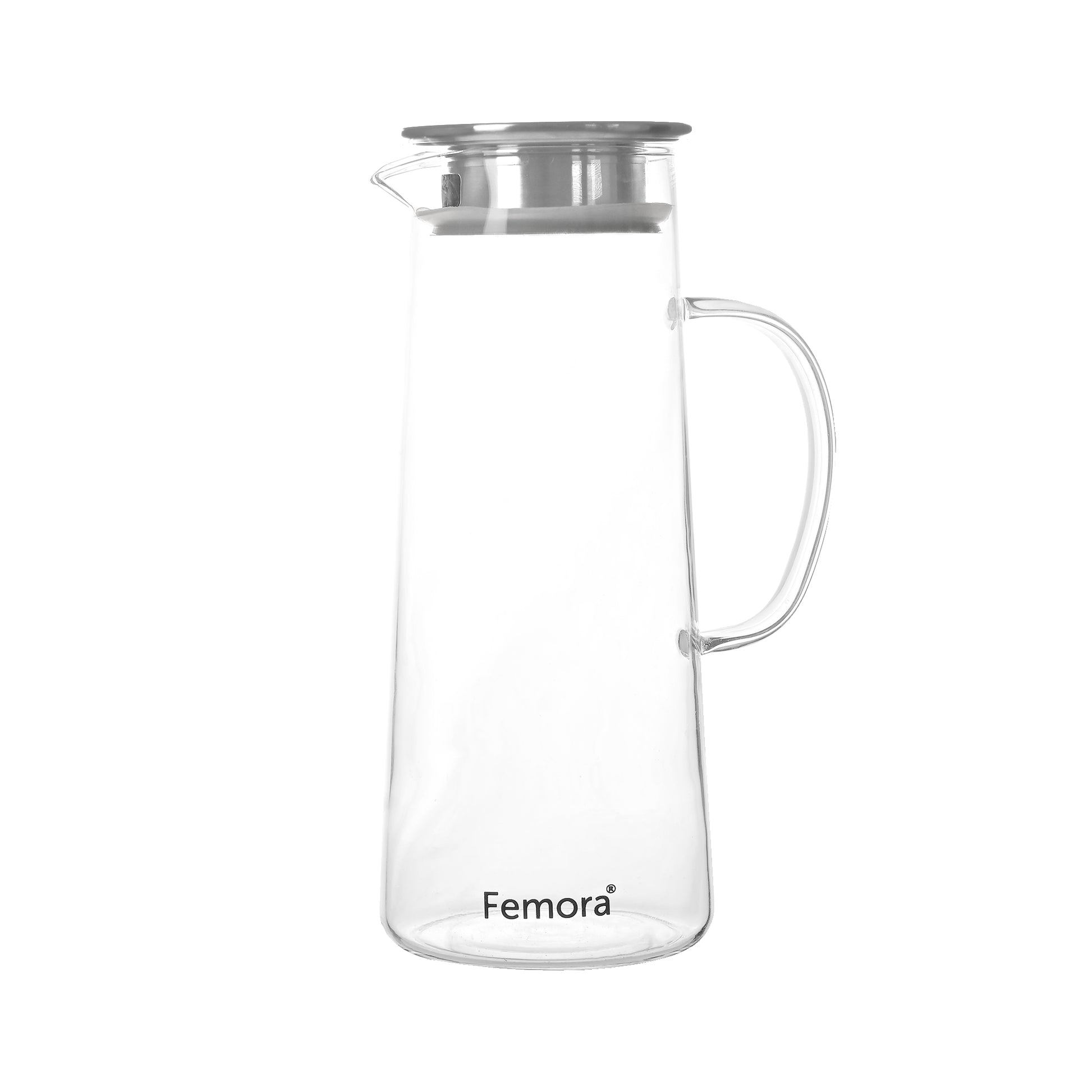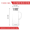 Femora Borosilicate Glass 1.5 Ltr Capacity Water Jug with Handle, Juice Beverage Carafe with Stainless Steel Lid, Big Glass Iced Tea Pitcher, 1 Pcs Set (BPA Free)