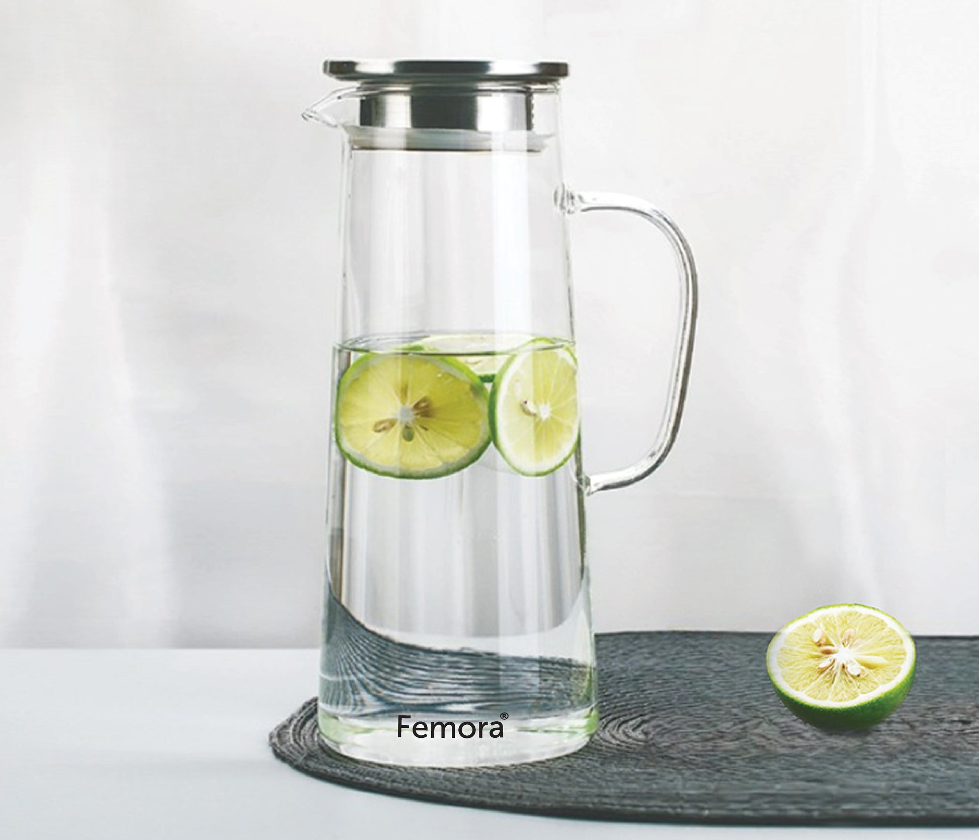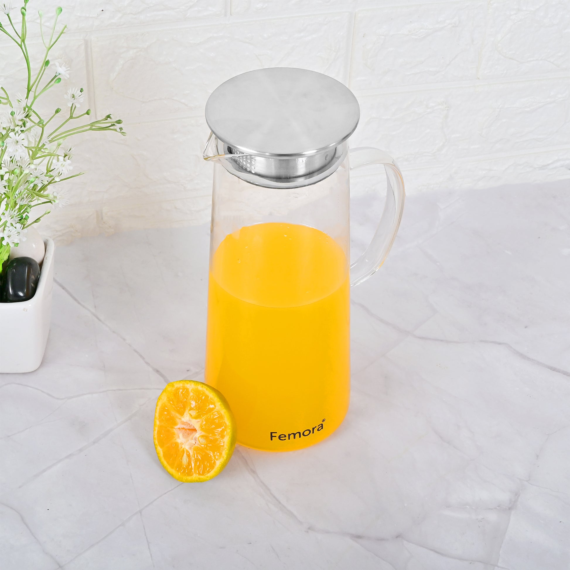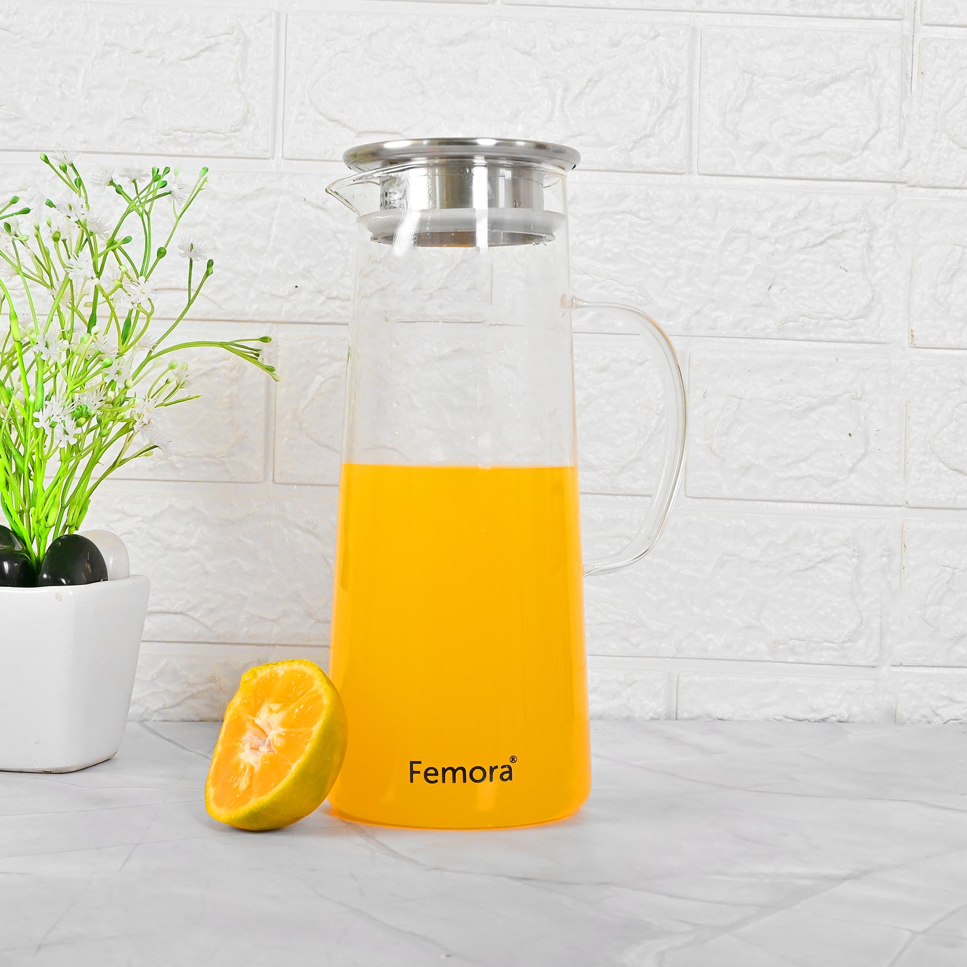 Femora Borosilicate Glass 1.5 Ltr Capacity Water Jug with Handle, Juice Beverage Carafe with Stainless Steel Lid, Big Glass Iced Tea Pitcher, 1 Pcs Set (BPA Free)