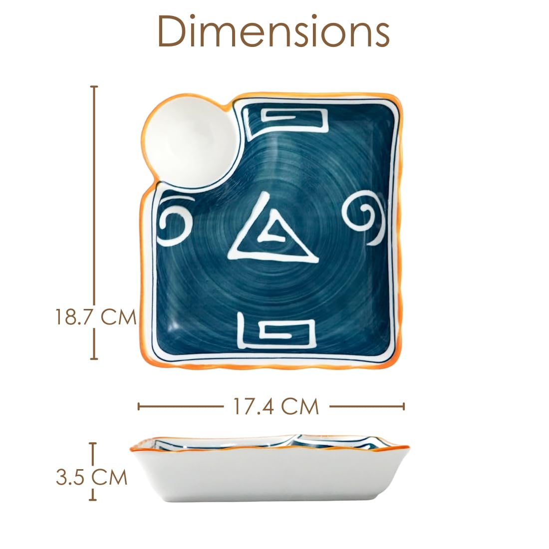 Generous Capacity : Ceramic Chip and Dip Snack Plate with Dip Section Perfect for various beverages. Perfect for Fries, Momos, Sushi, Kebab