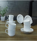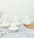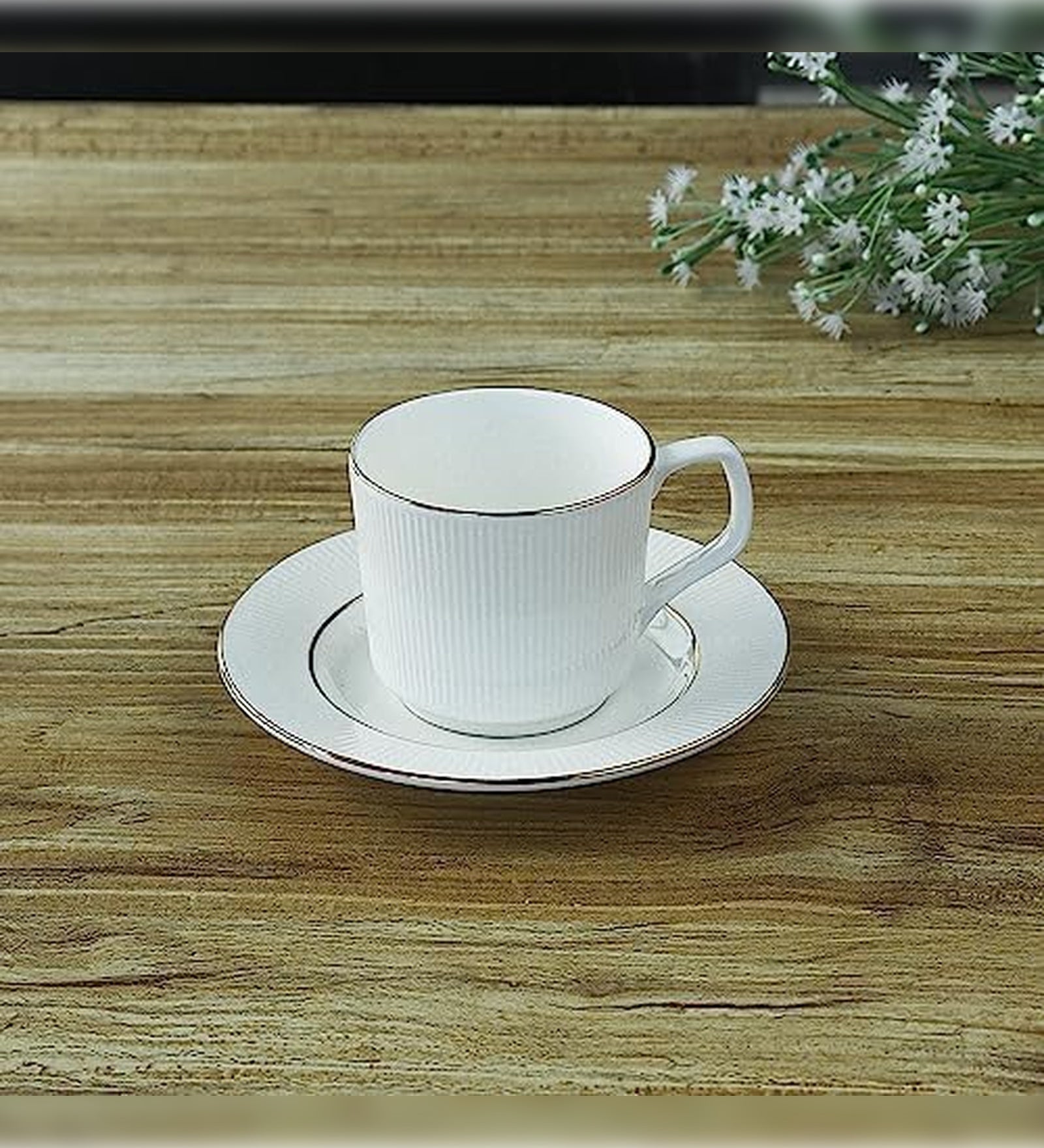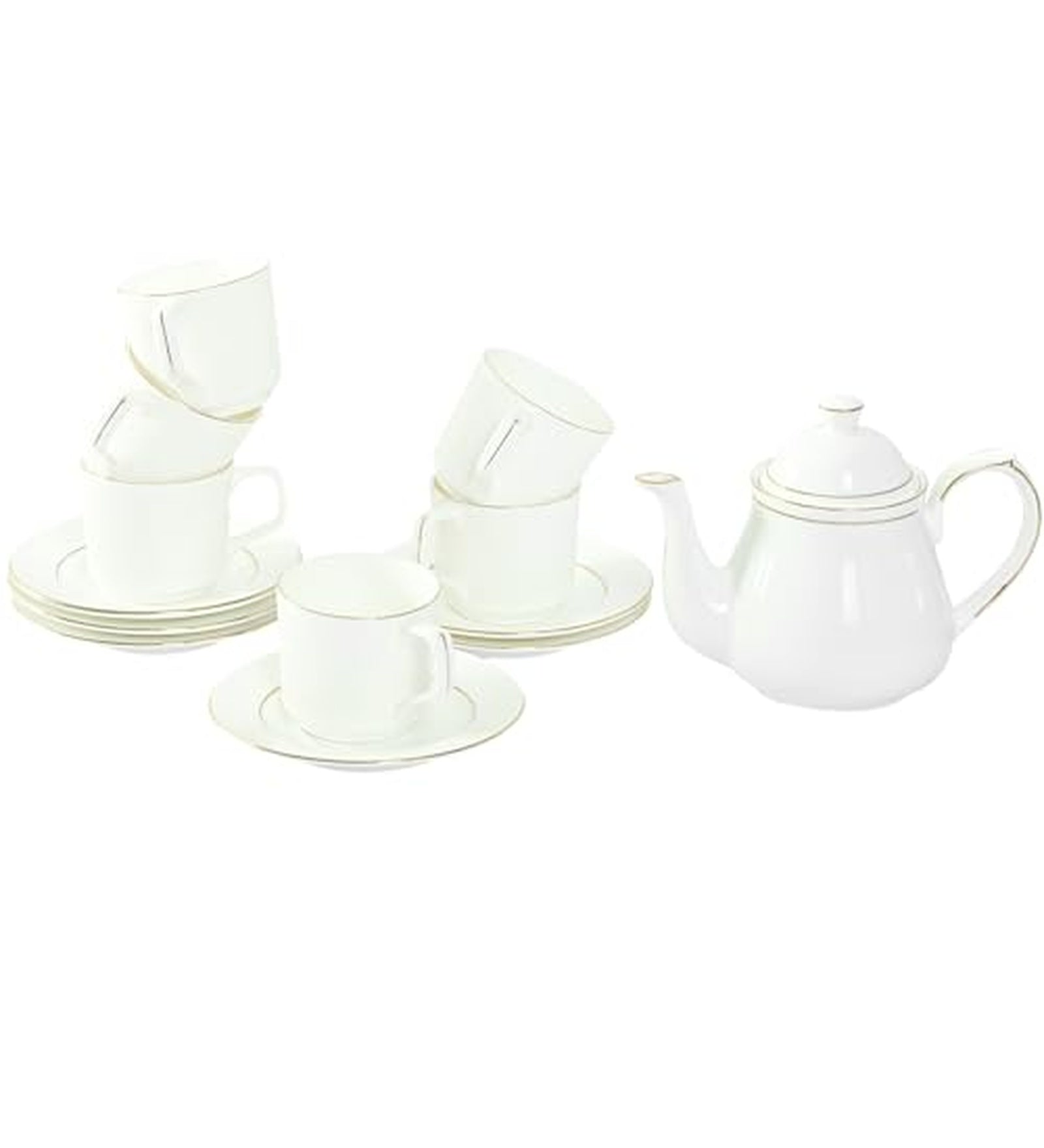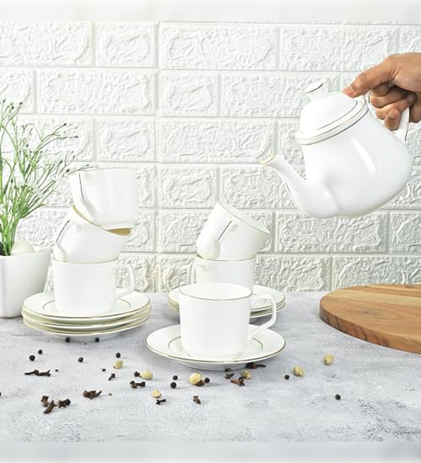 Femora Ceramic Gold Line with Vertical Bar White Ceramic Tea Cups and Saucers with Tea Kettle Set -200 ml Set of 13 (6 Cups, 6 Saucer, 1 Kettle)