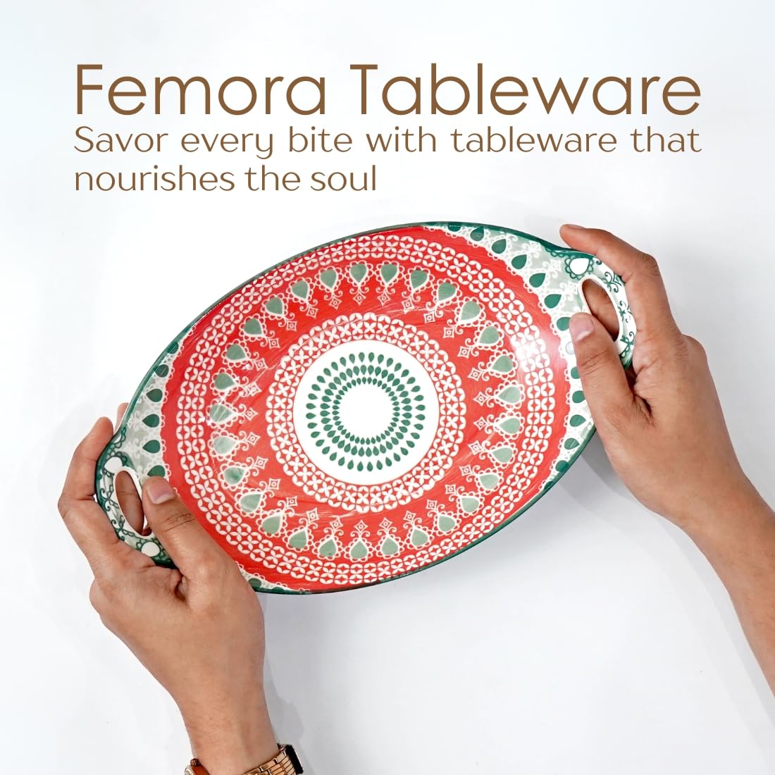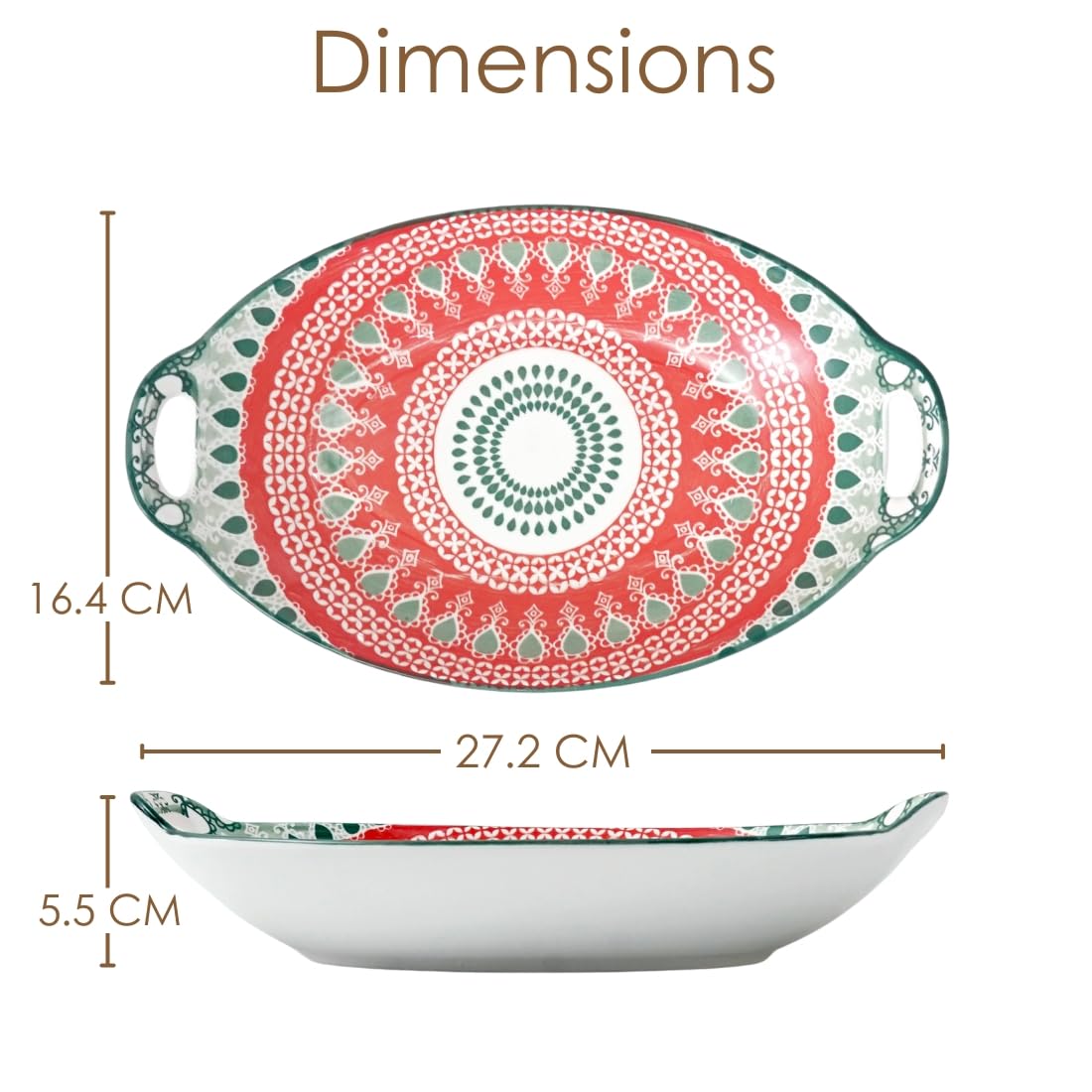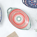 Femora Mandala Ceramic Long Dish with Handles (10.8 Inch) - Elegant Oval Serving Platter for Snacks, Appetizers, Salads, and Noodles | Microwave & Dishwasher Safe (Red & Green)