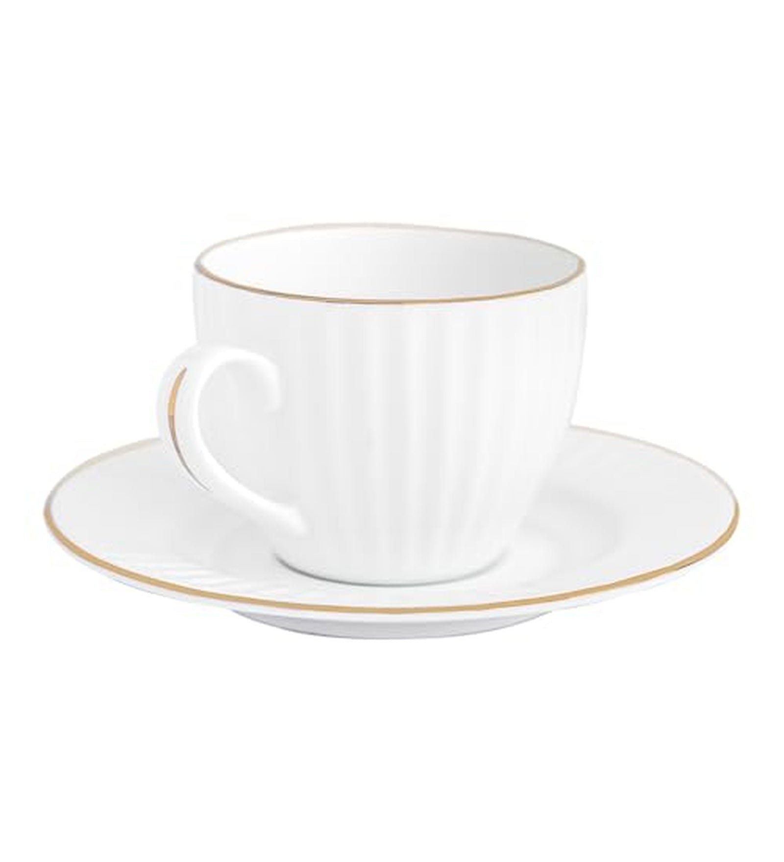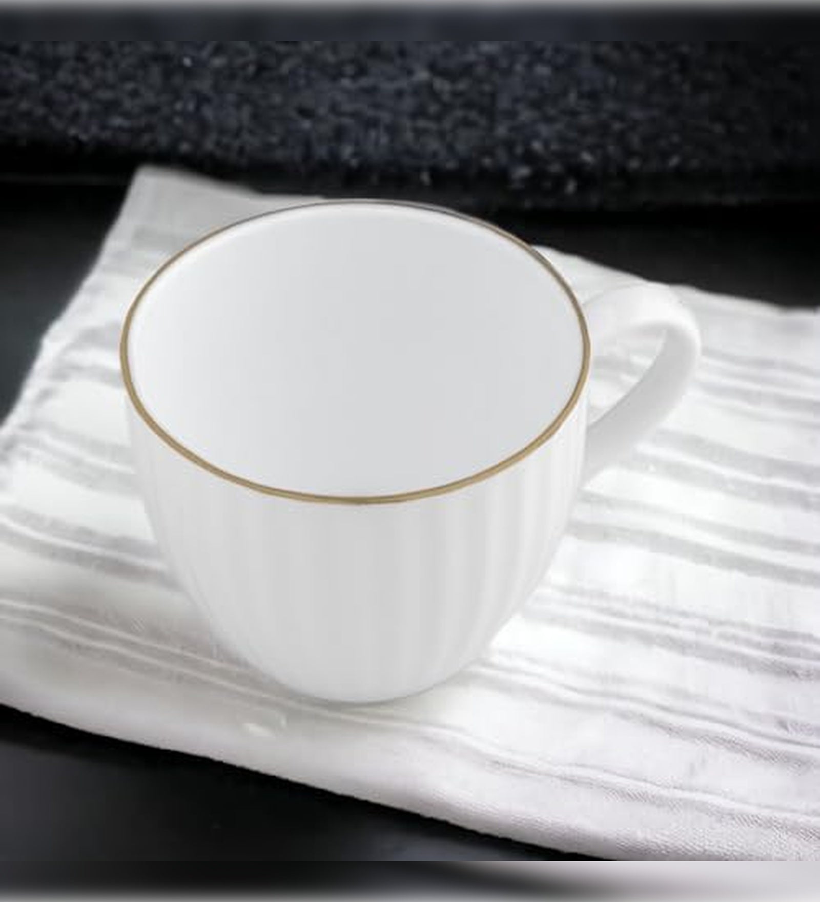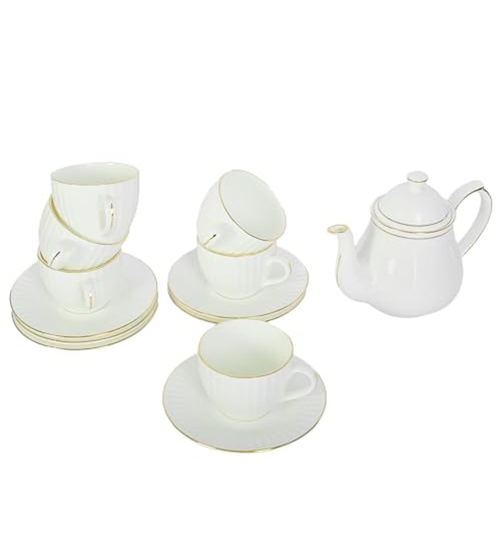 Femora Golden Vertical Line Pattern White Ceramic Tea Cups and Saucers with Tea Kettle Set -200 ml Set of 13 (6 Cups, 6 Saucer, 1 Kettle)