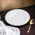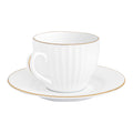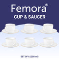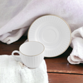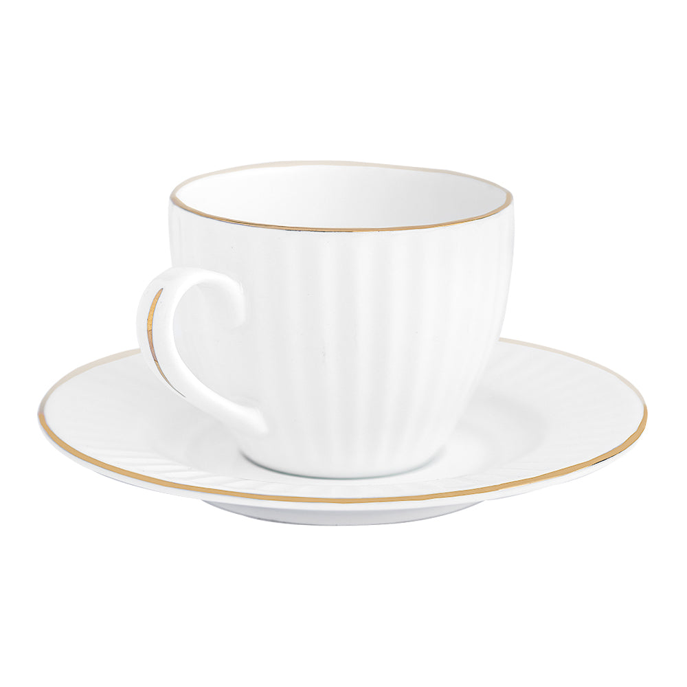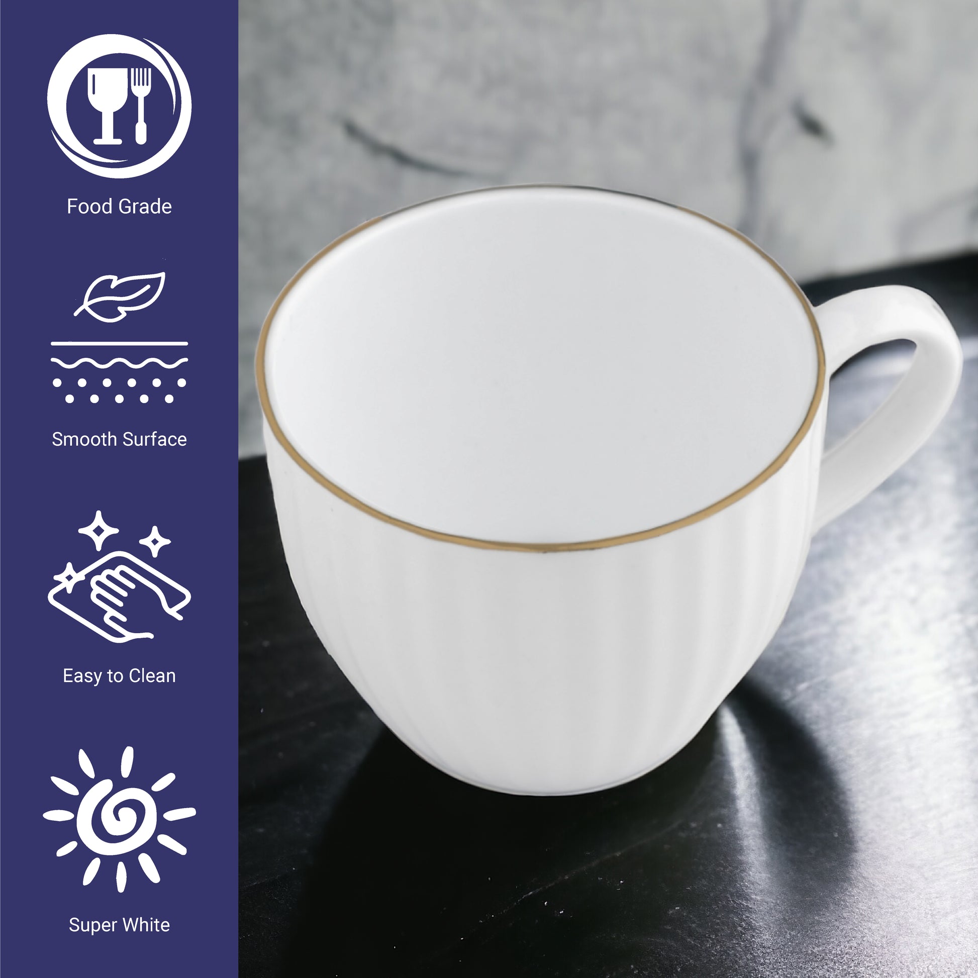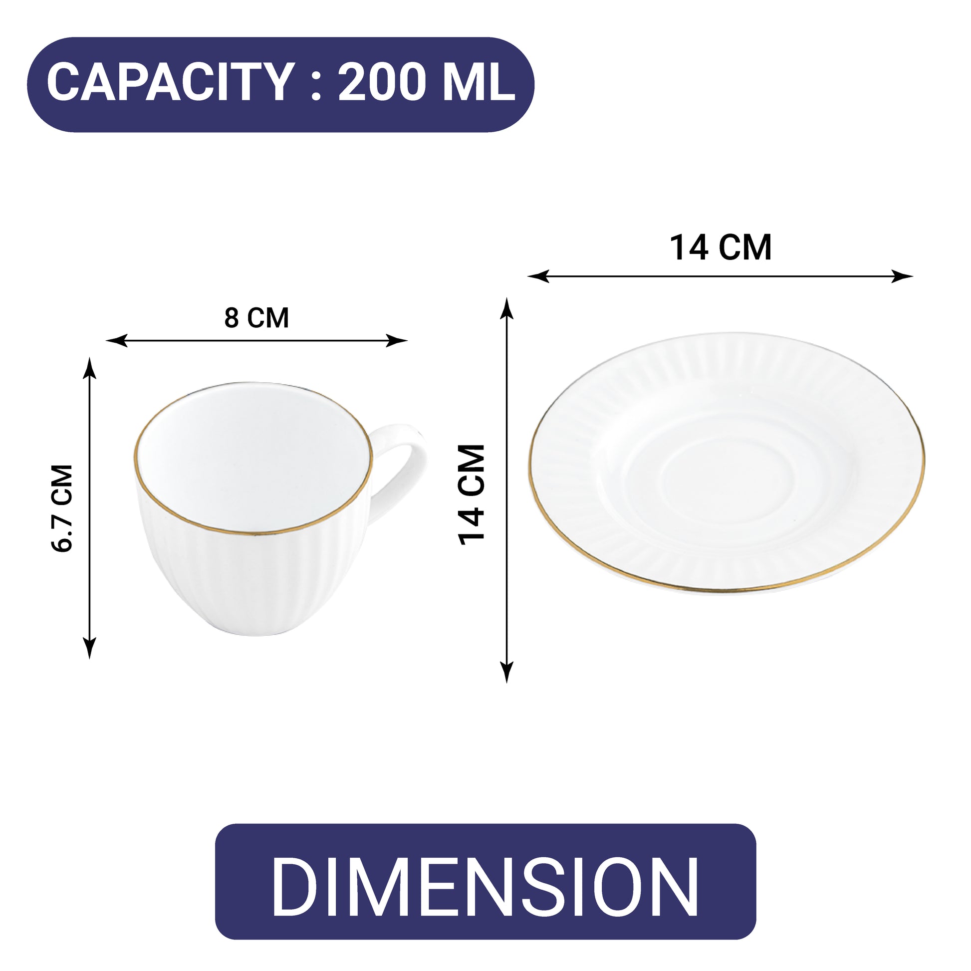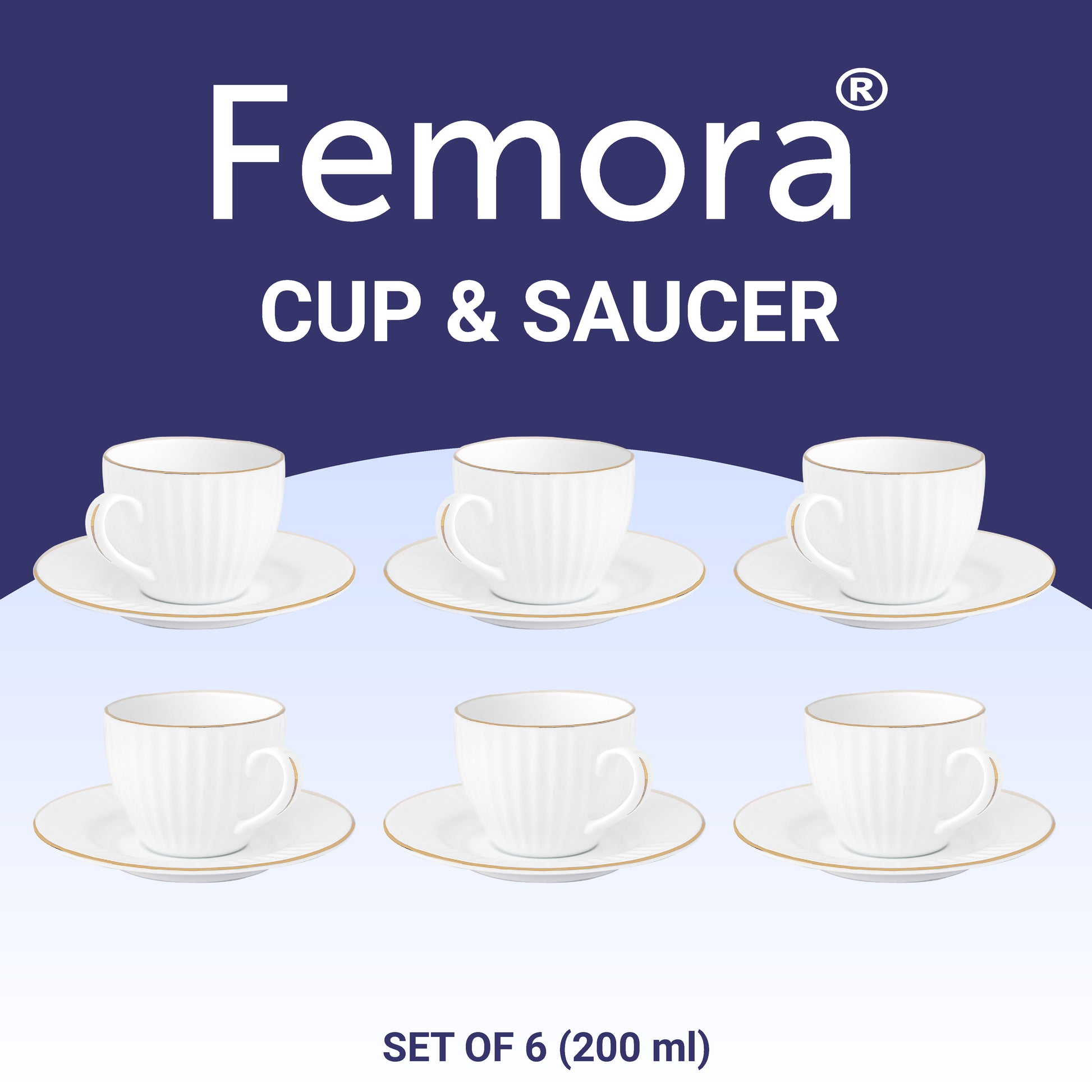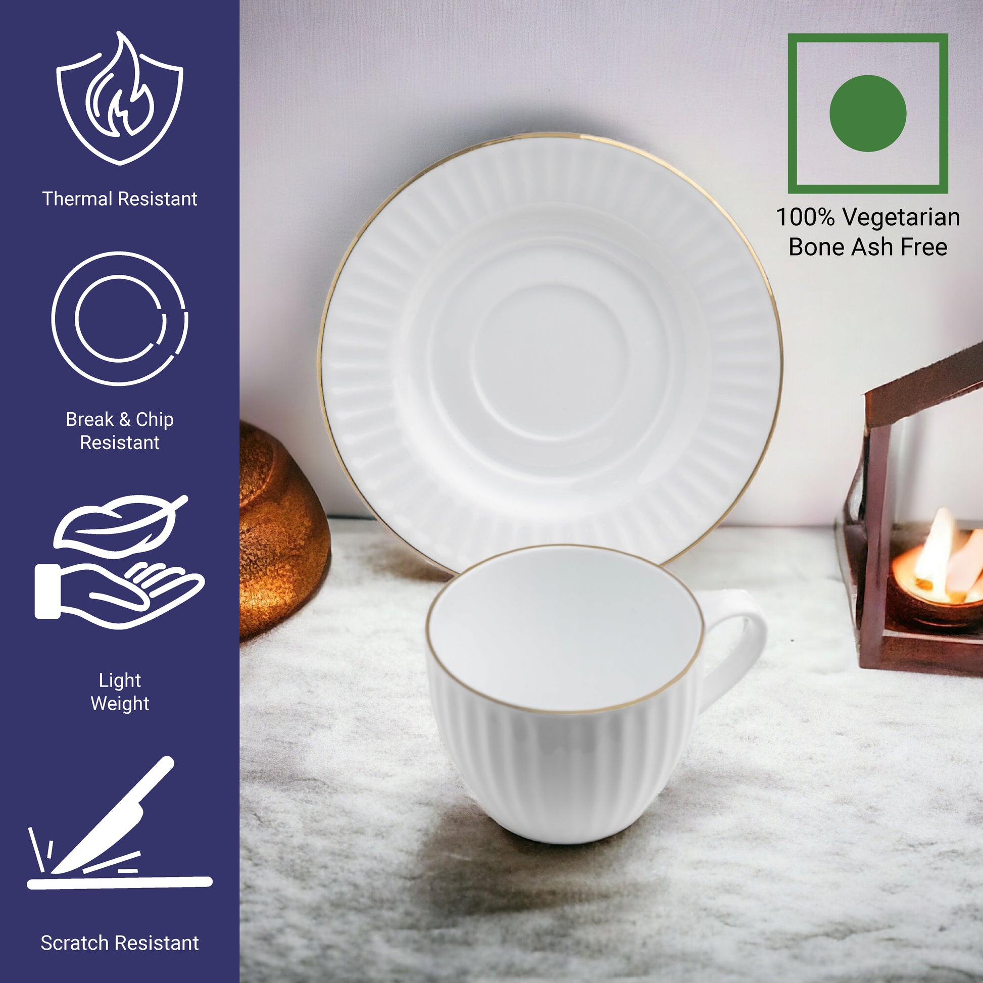 Ceramic Golden Vertical Line Pattern White Tea Cups Set with Saucer, 200 ML, 6 Cups, 6 Saucers, Femora