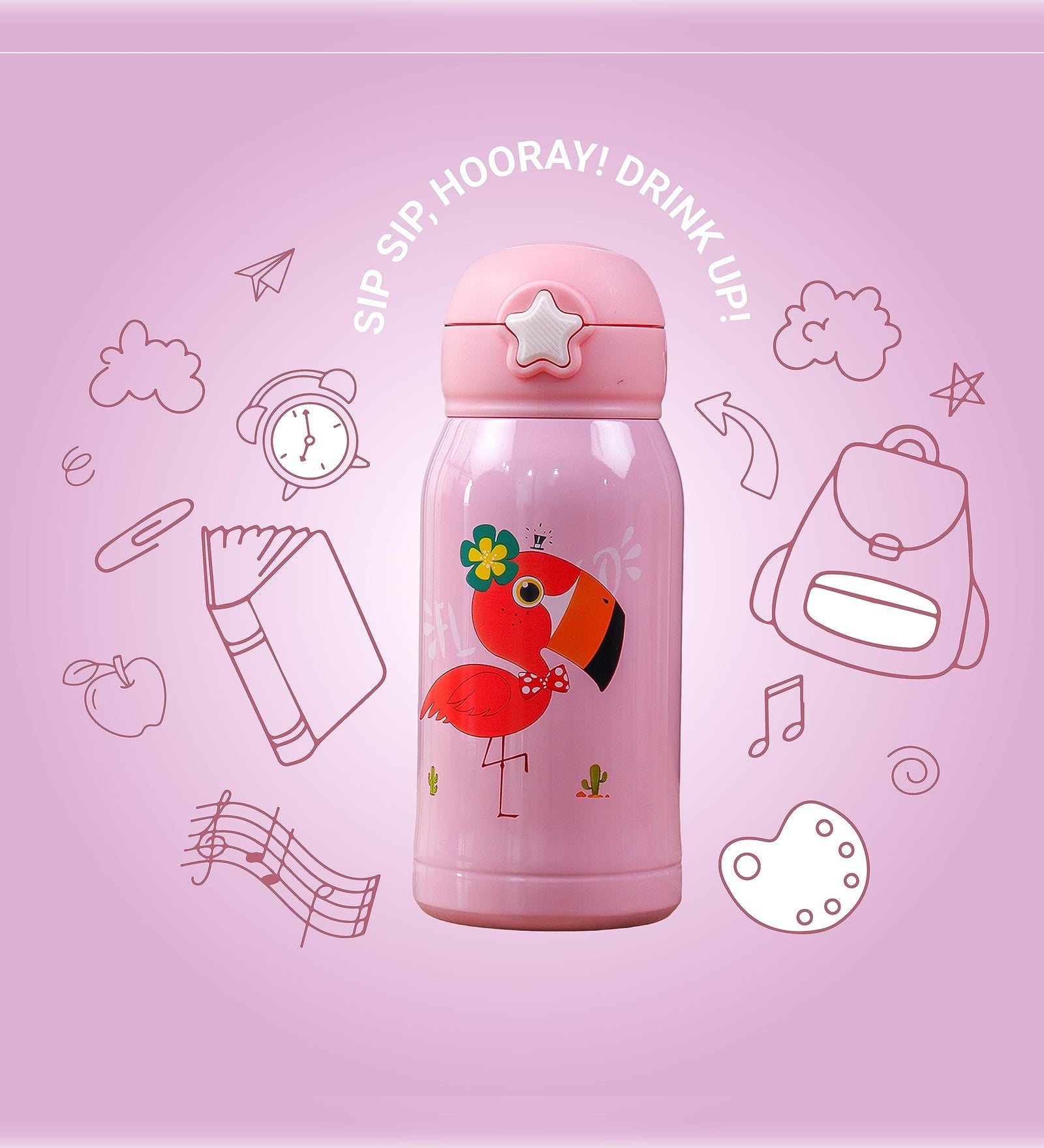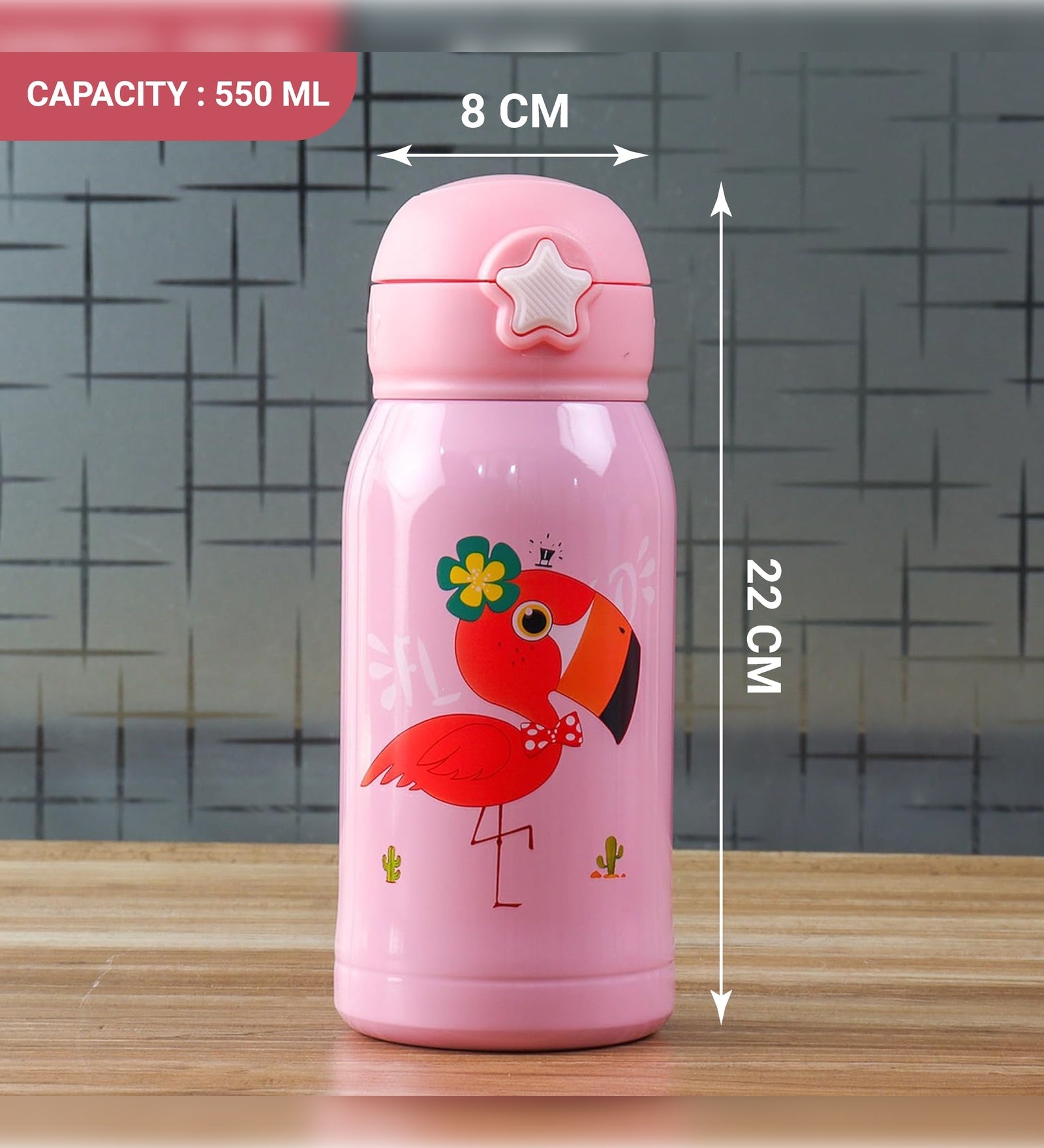 Stainless Steel Kids Flamingo Design Hot & Cold Thermo Steel Pink Water Bottle, 550 ML, Femora