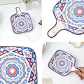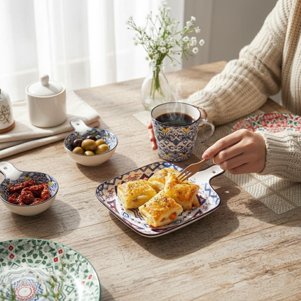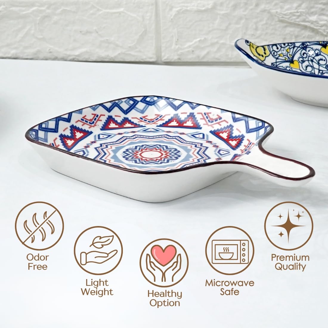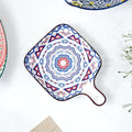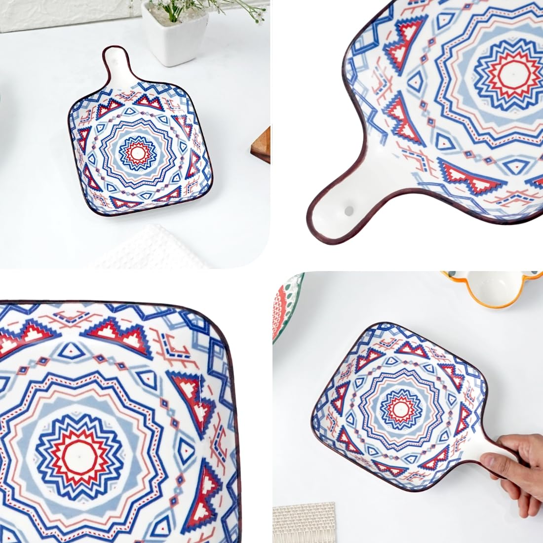 Femora Mandala Ceramic Snack Plates (White & Blue) - Square Dessert Plates with Handle for Baking and Serving Desserts, Snacks & Appetizers | Microwave Safe (9 Inch Each)