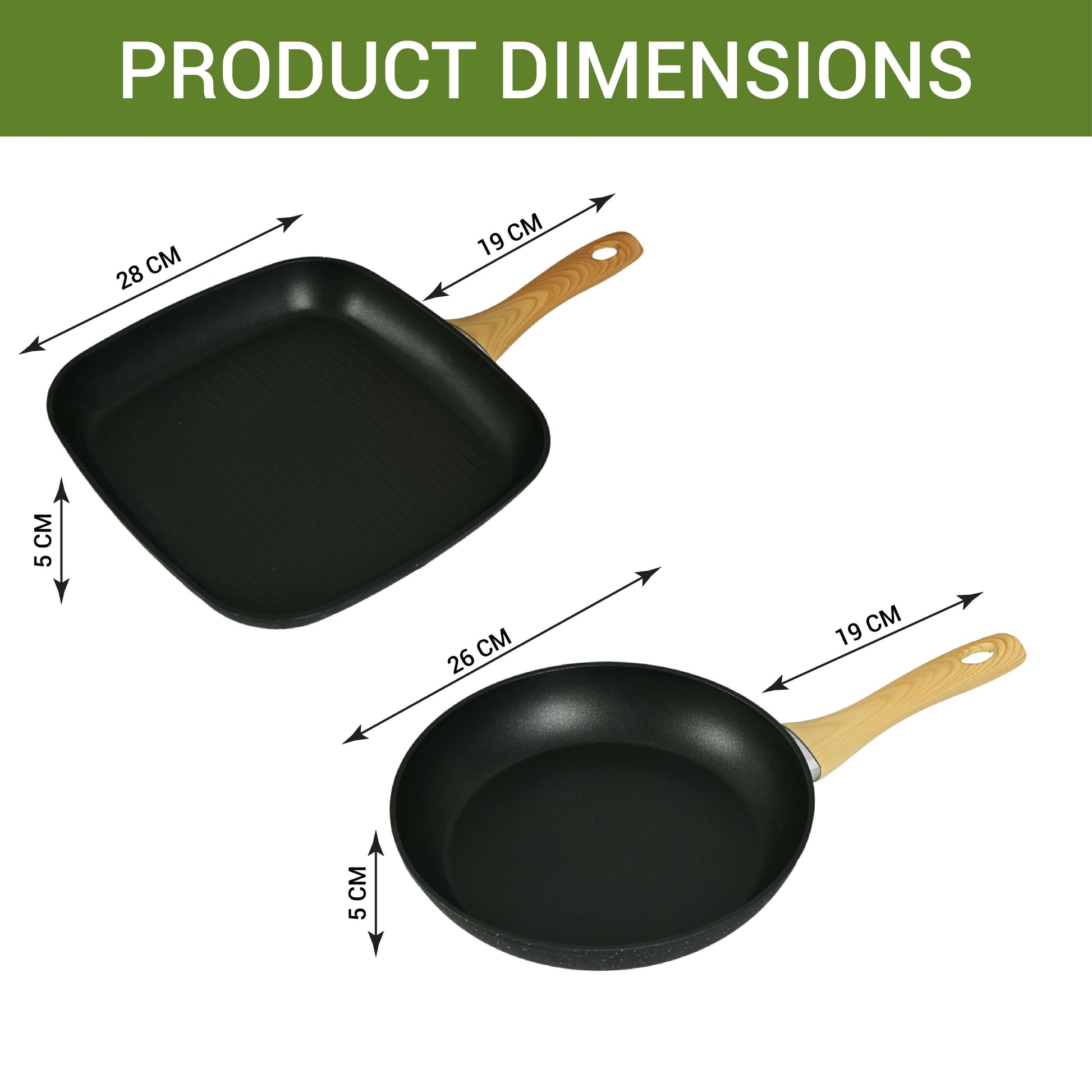 - Dimension: Frypan 26 CM- Diameter: 26 CM. Side Wall Height:- 5 CM, Length with Handle:- 45 CM.. Grill pan 28 CM- Length with Handle:- 47 CM, Width:- 28 CM, Side Wall Height:- 5 CM. Package Content:- 1 Frypan+ 1 Grill pan