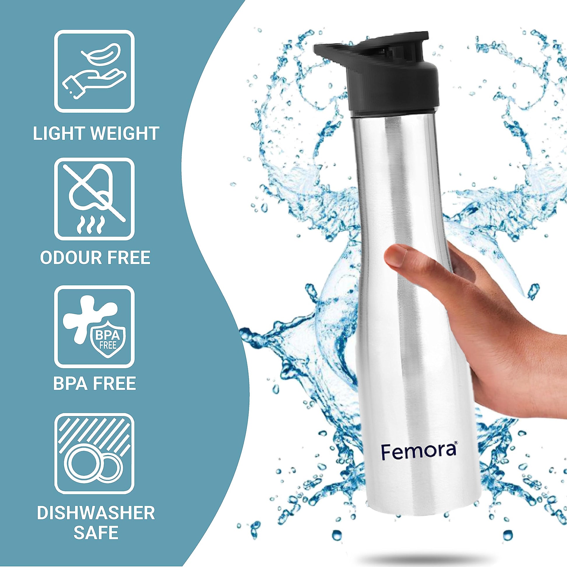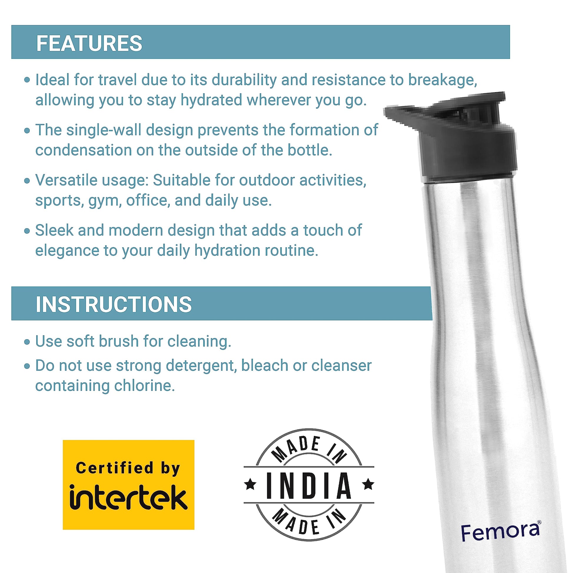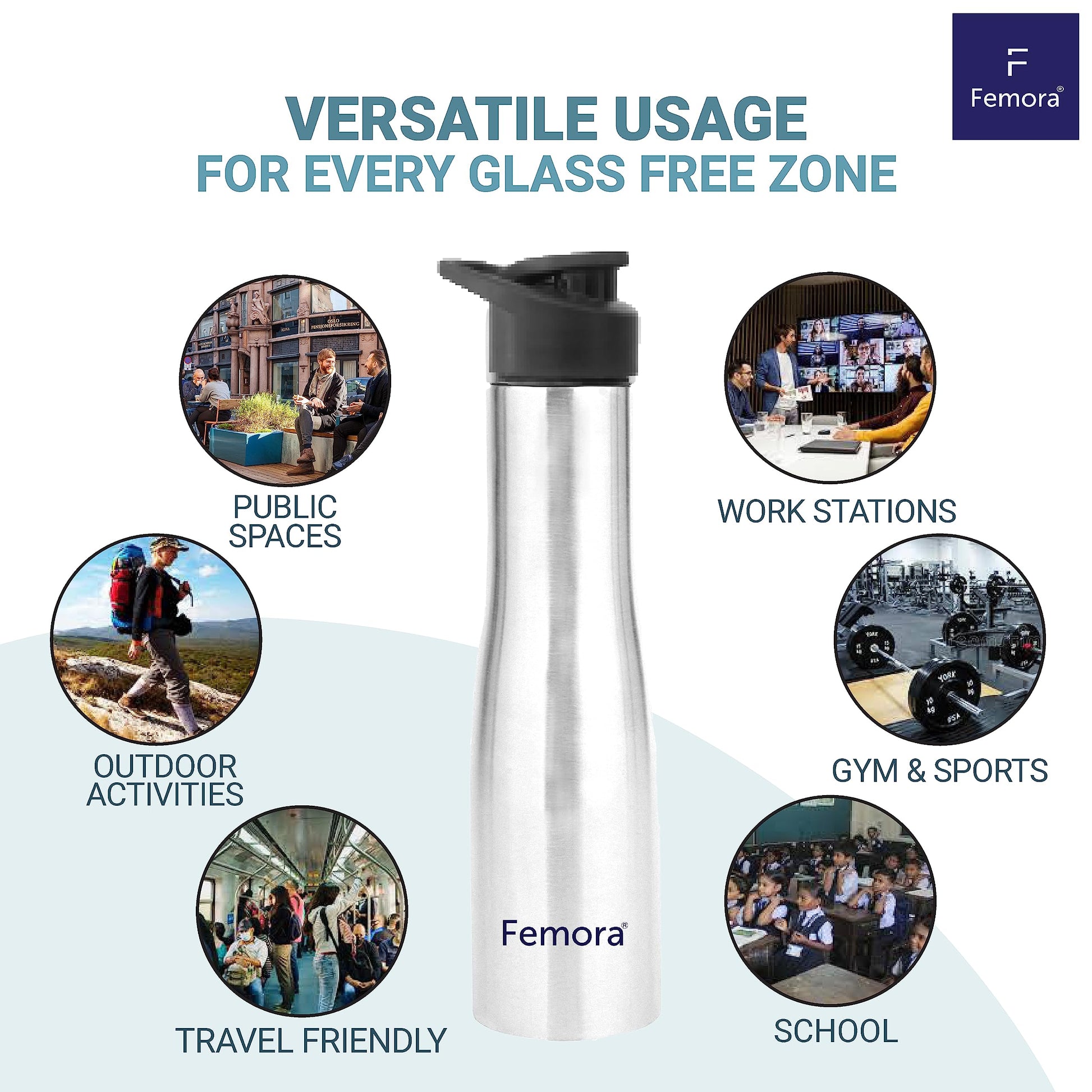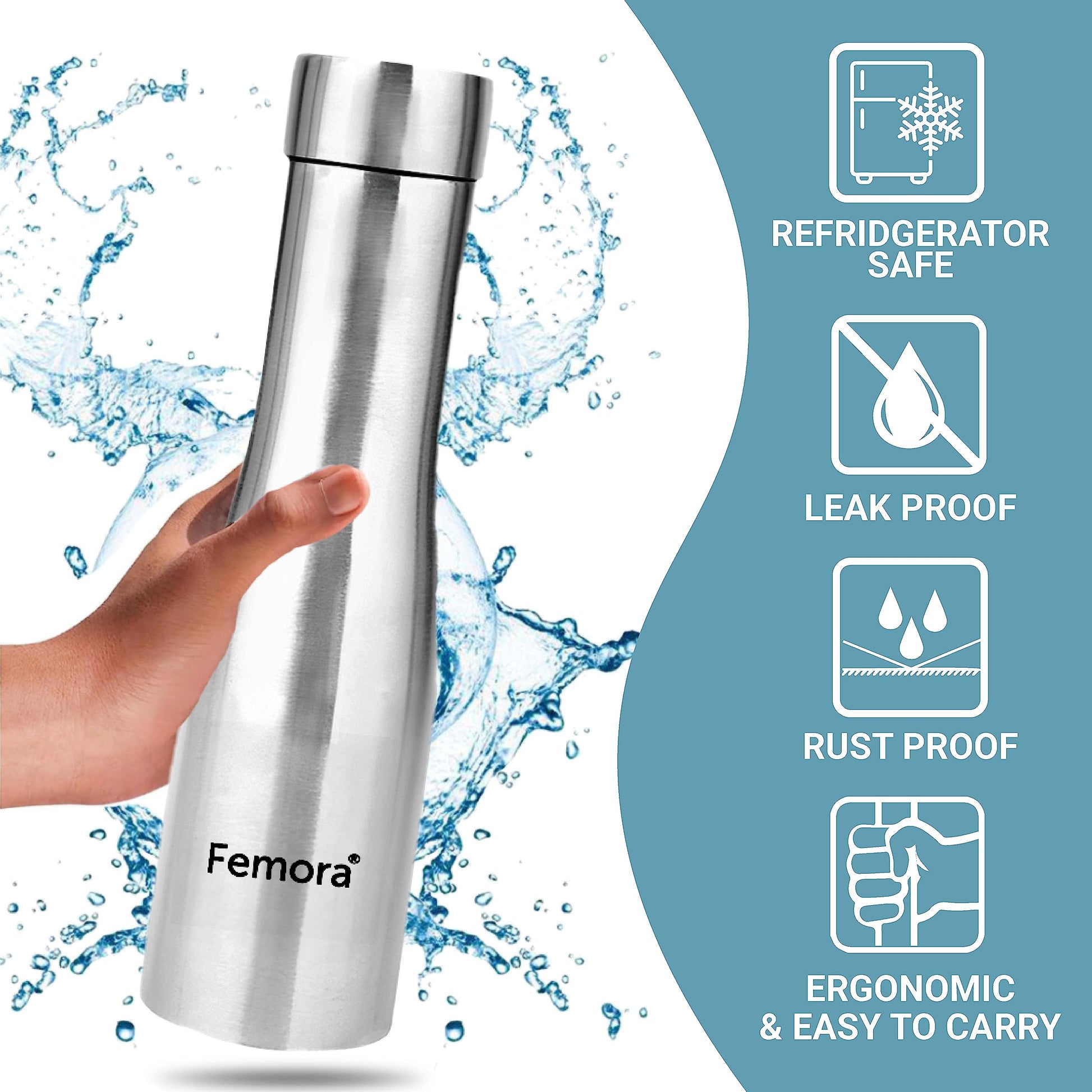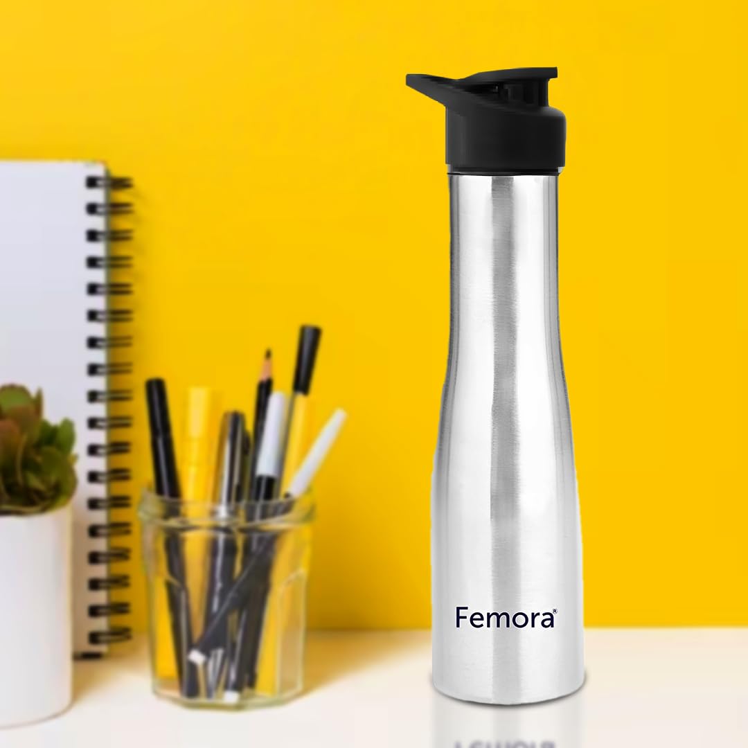 Femora Stainless Steel Water Bottle 2in1 Fridge Bottle Sports Bottle - 1000 ML, Steel Cap & Sipper Cap, 2 cap in