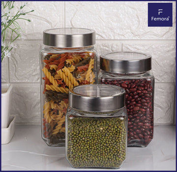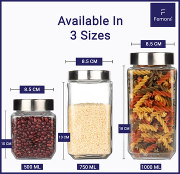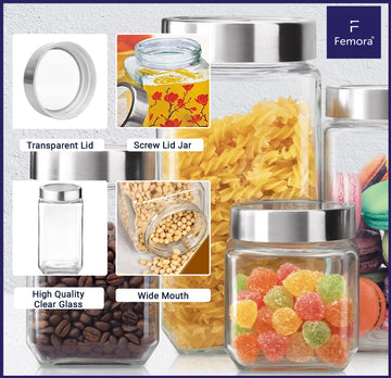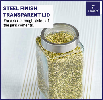 Material :- Glass Jars Lid:- Stainless Steel Transparent Lid.