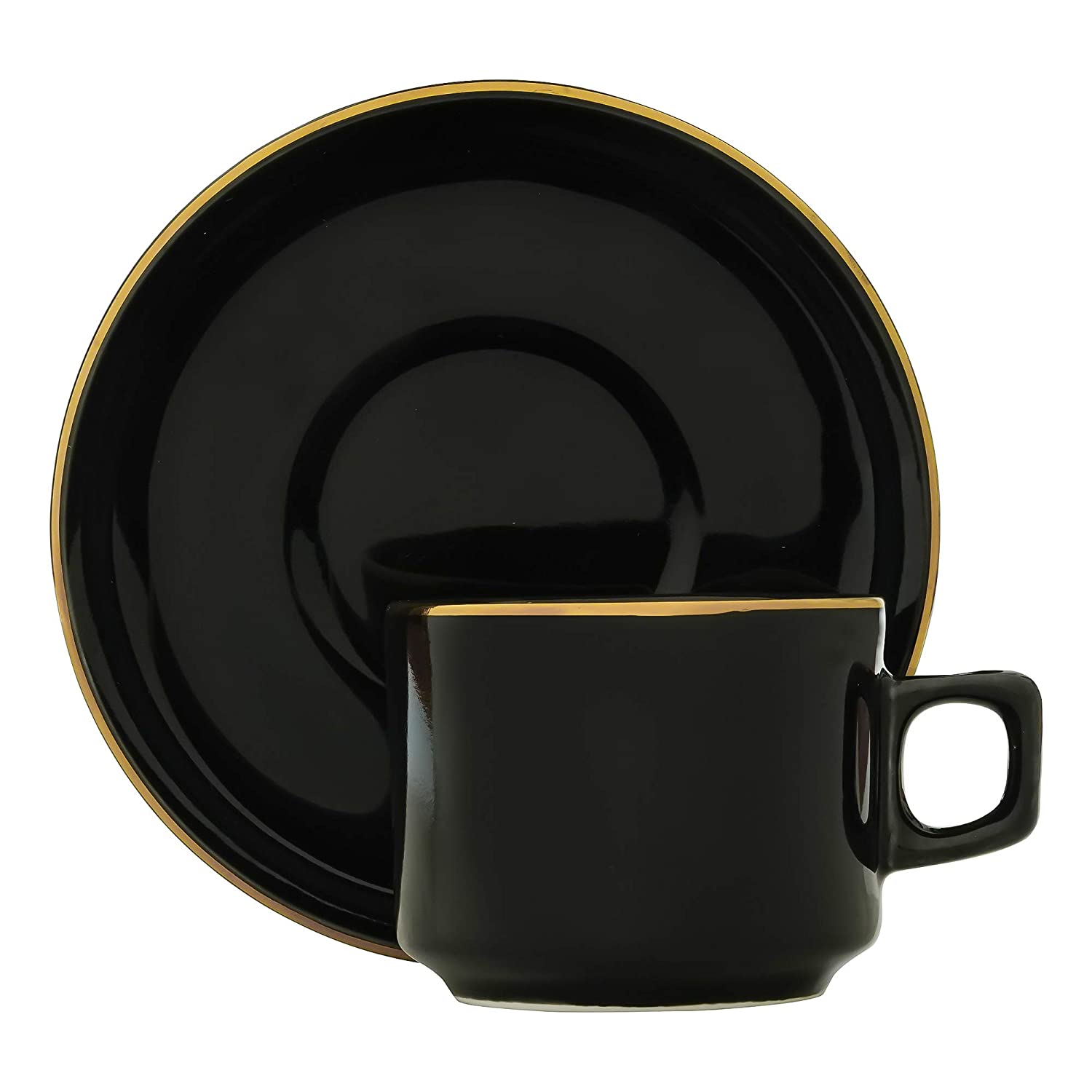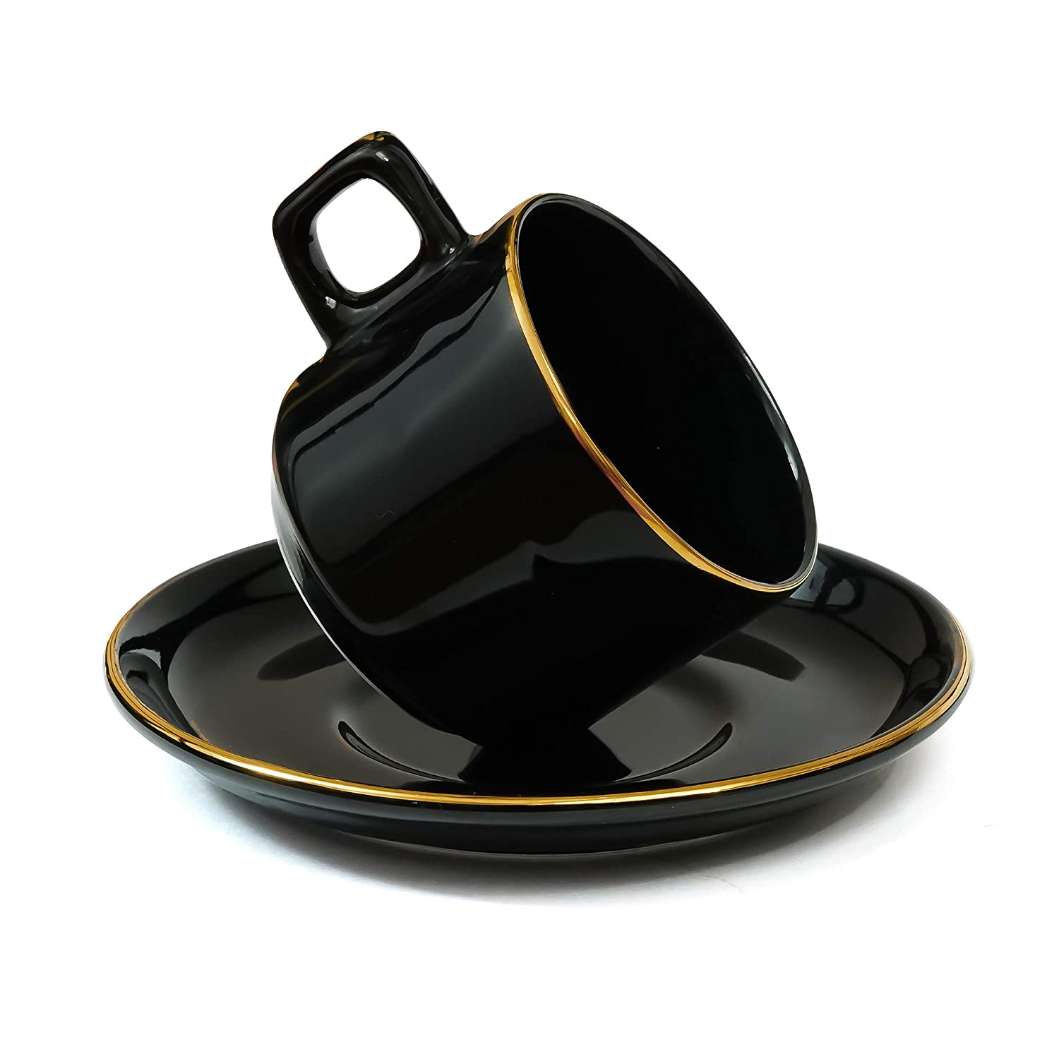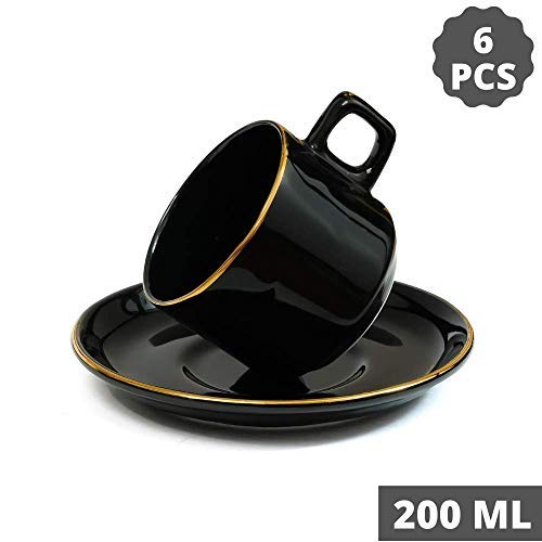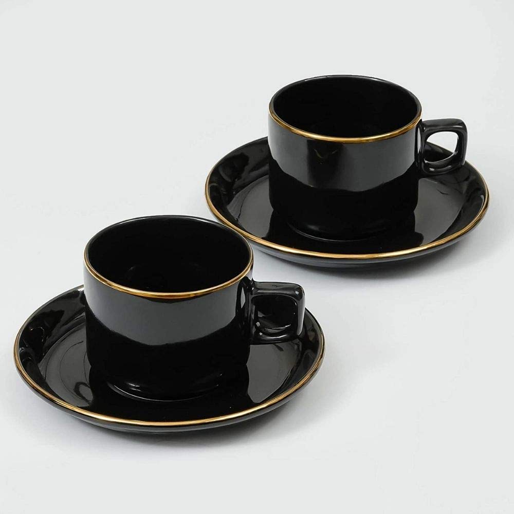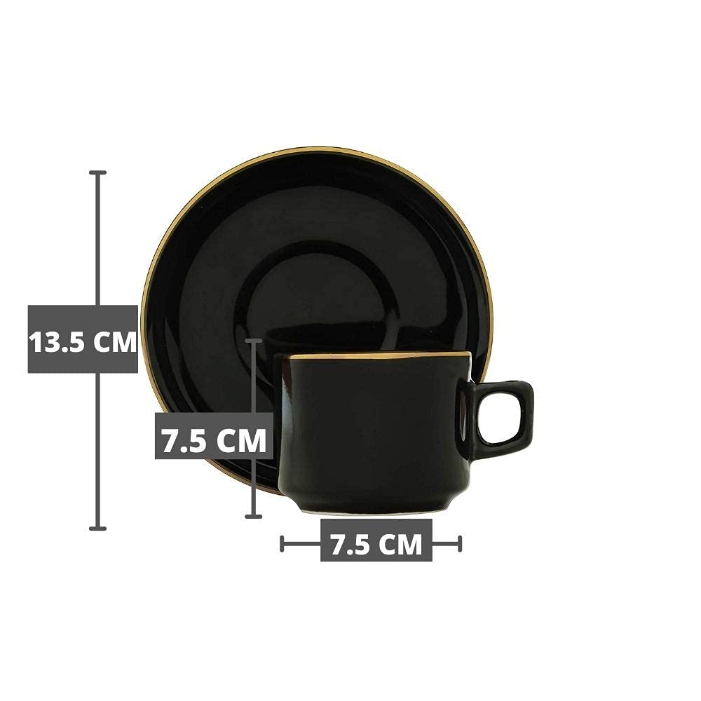 Ceramic Handmade Black Gold Plated Tea Cup With Saucers, 200 ML,Black , Femora