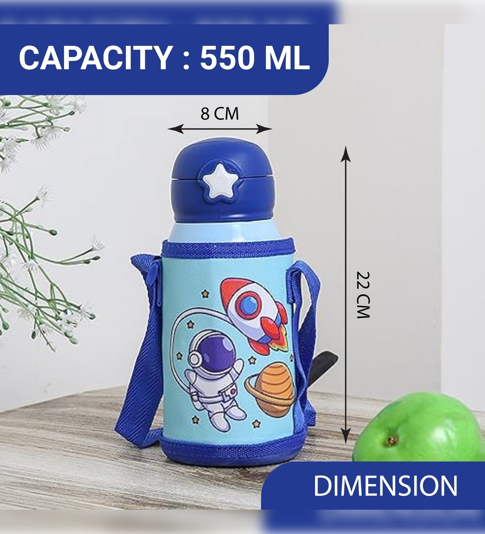 Stainless Steel Kids Galaxy World Design Hot & Cold Thermo Steel Blue Water Bottle, 550 ML, Femora