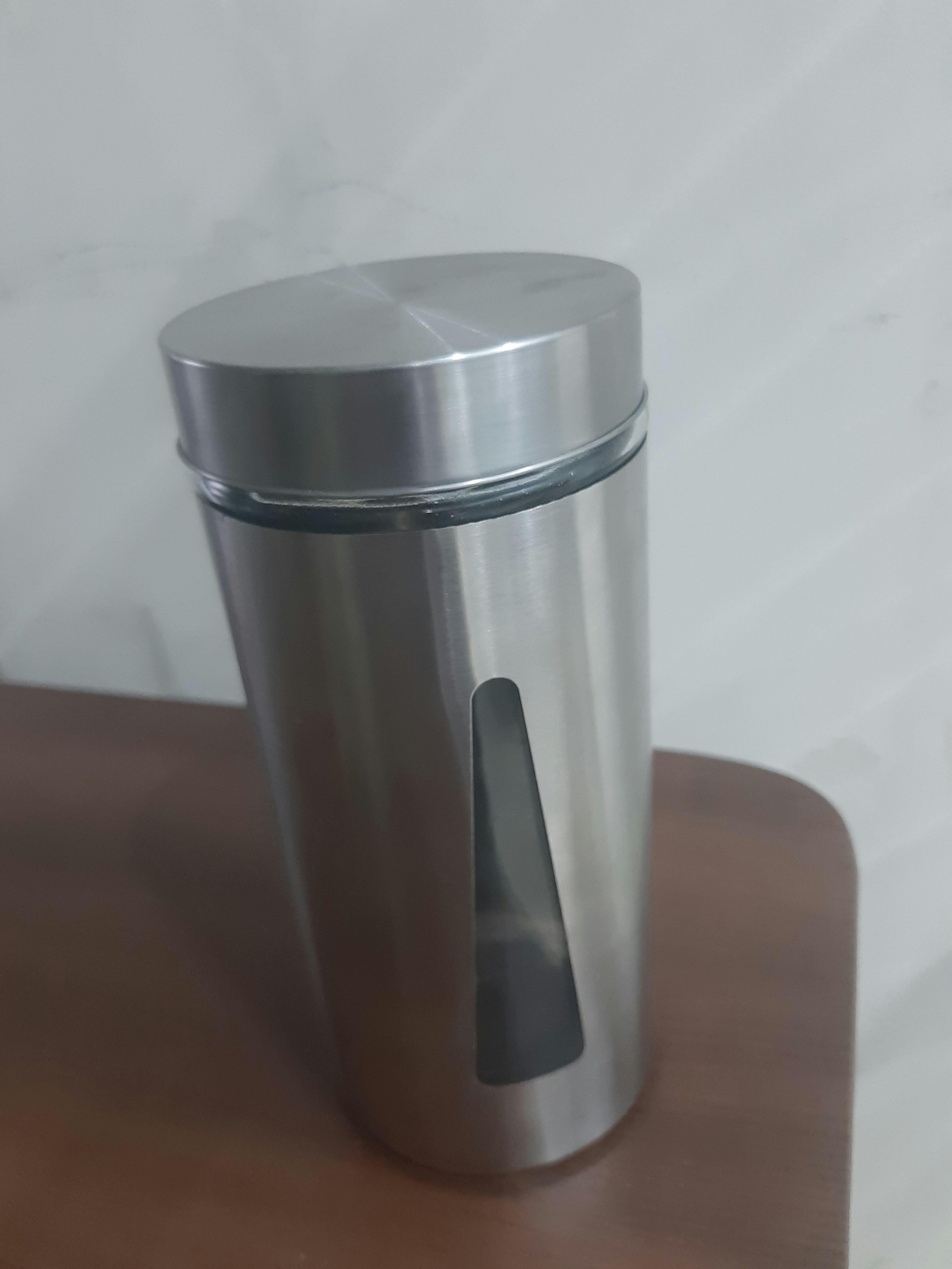 Material :- Out Side Stainless Steel Finish Inside Clear Glass Jar Lid:- Stainless Steel Lid.