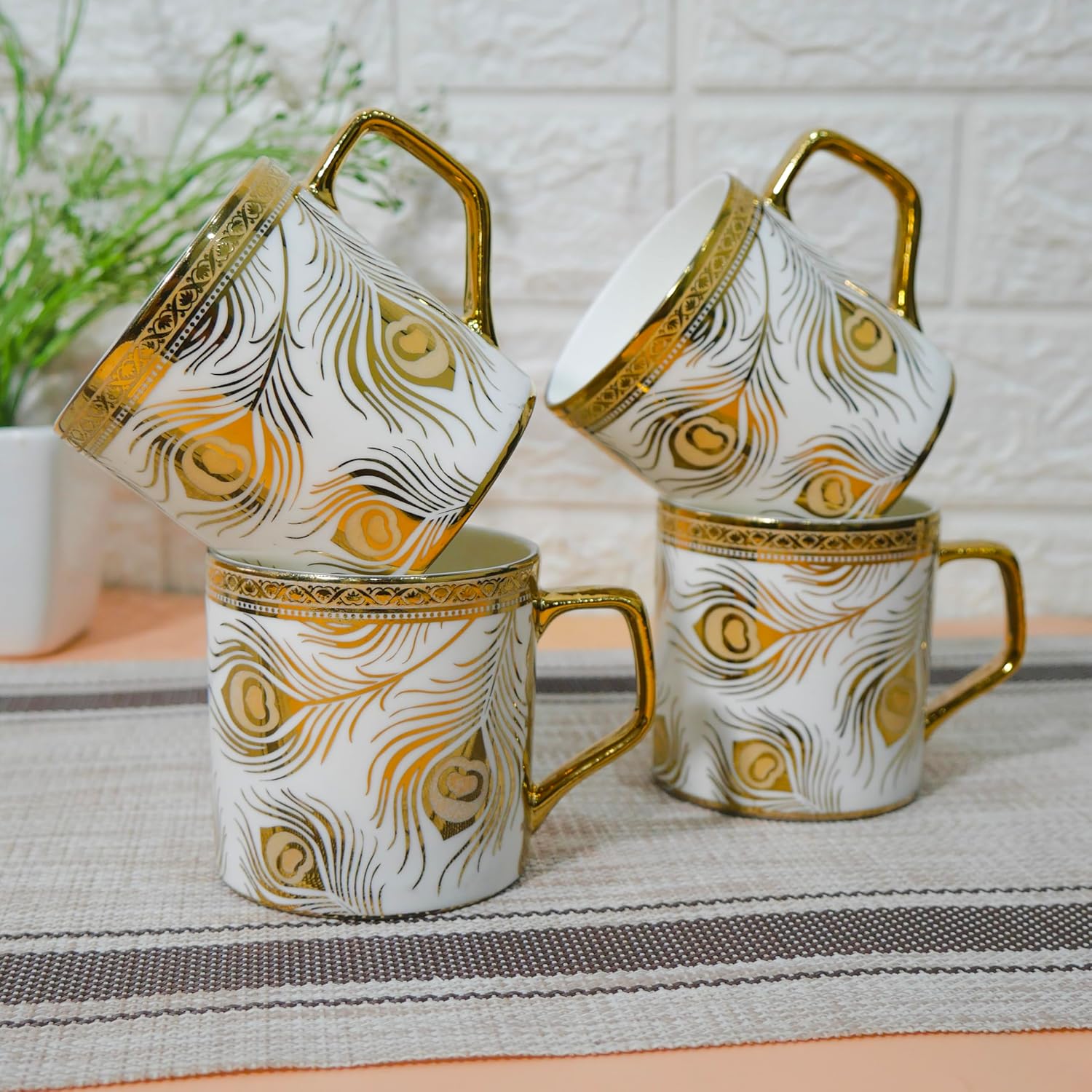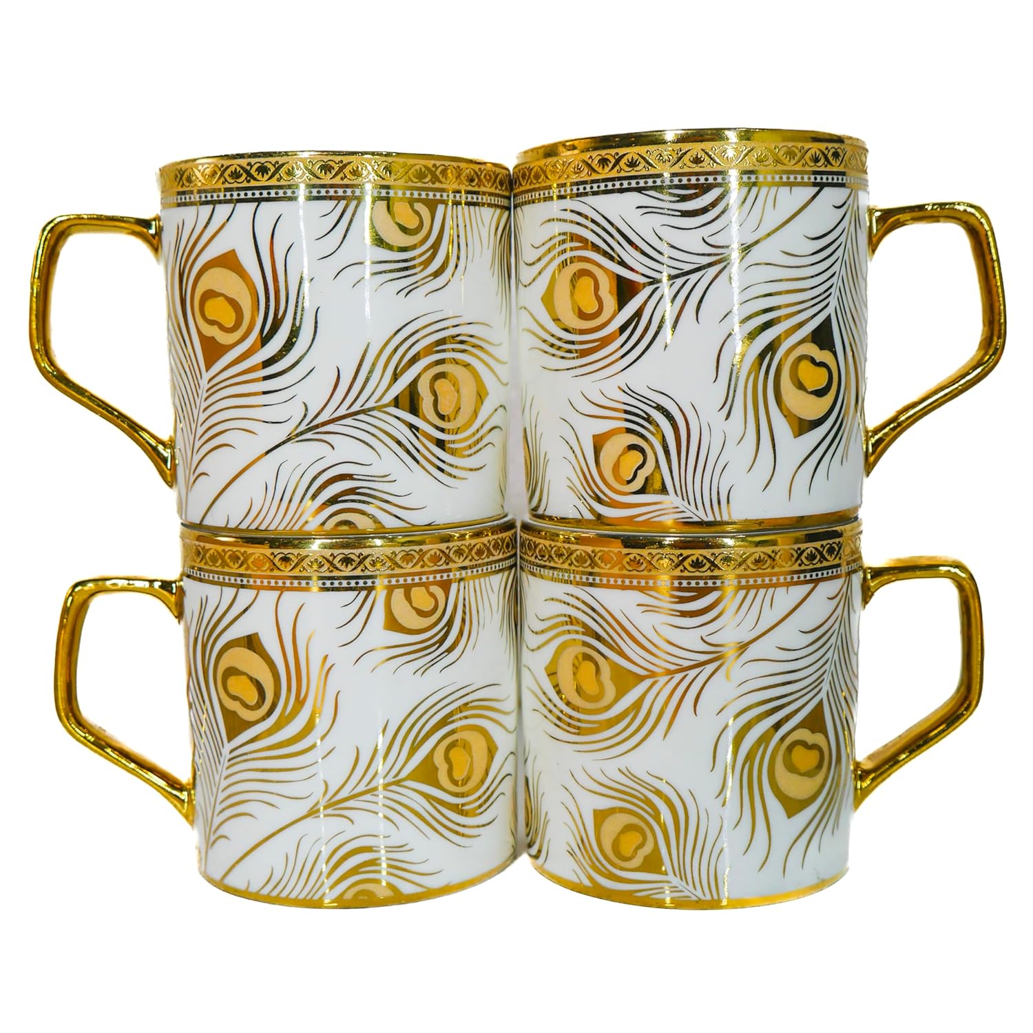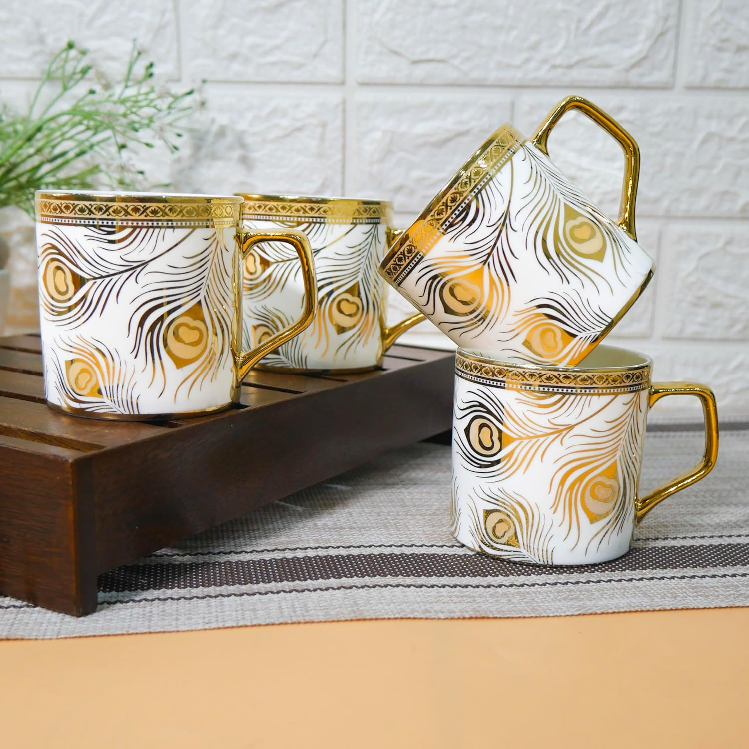 Premium Golden Peacock Feather Pattern Design Ceramic Coffee & Tea Cup Set of 4, 180 ML