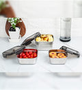 Comprises of borosilicate glass containers combinations which is easy to carry, leak proof and air tight. It can be used in microwave (without lids) in office.
