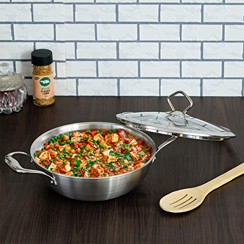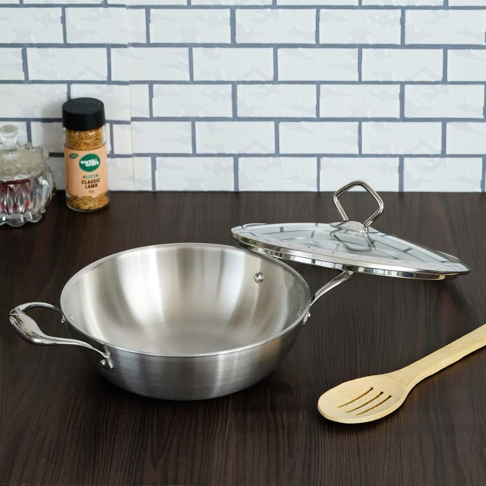 Tri-ply Deep Frying Kadhai Pan 22x7.5cm with Glass Lid -Zero Non-Stick Coating